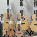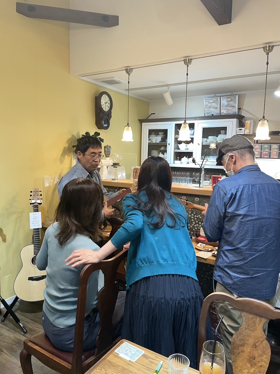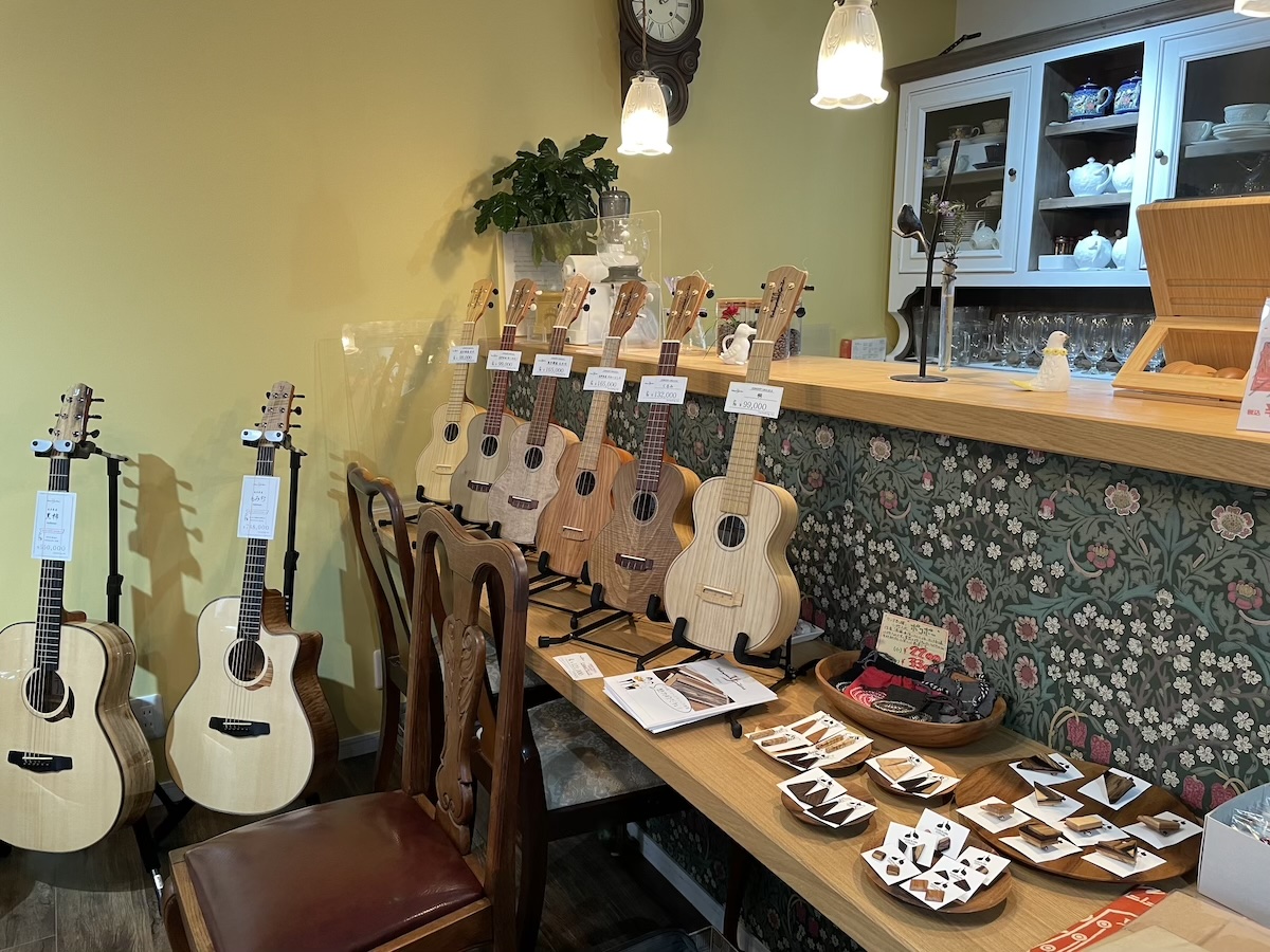 演者さんのギターや、持ち込んだギター&ウクレレを、皆さまわいわいとお試しいただきます。アクセサリー類も人気で嬉しいです。