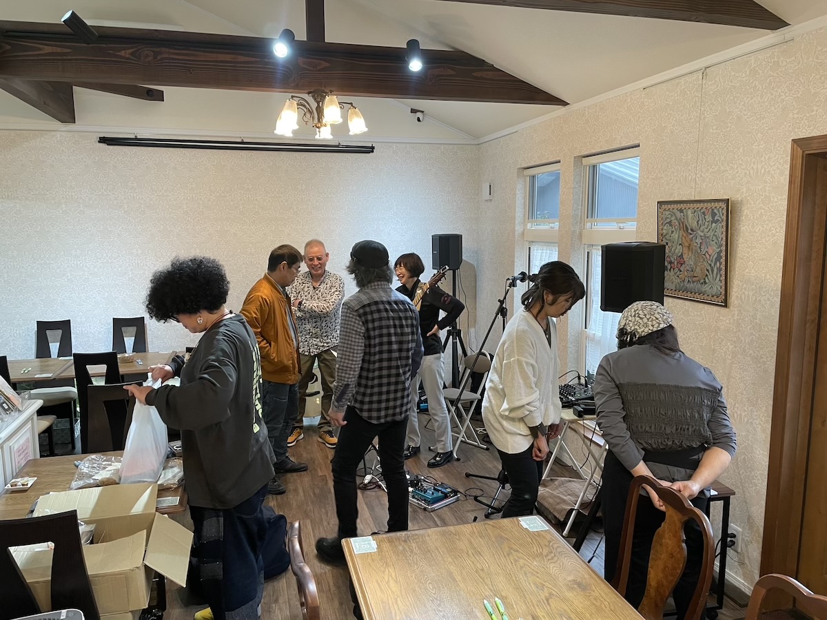到着すると、早々にリハーサル中でした。横で、持参した楽器類をレイアウトさせていただきます。