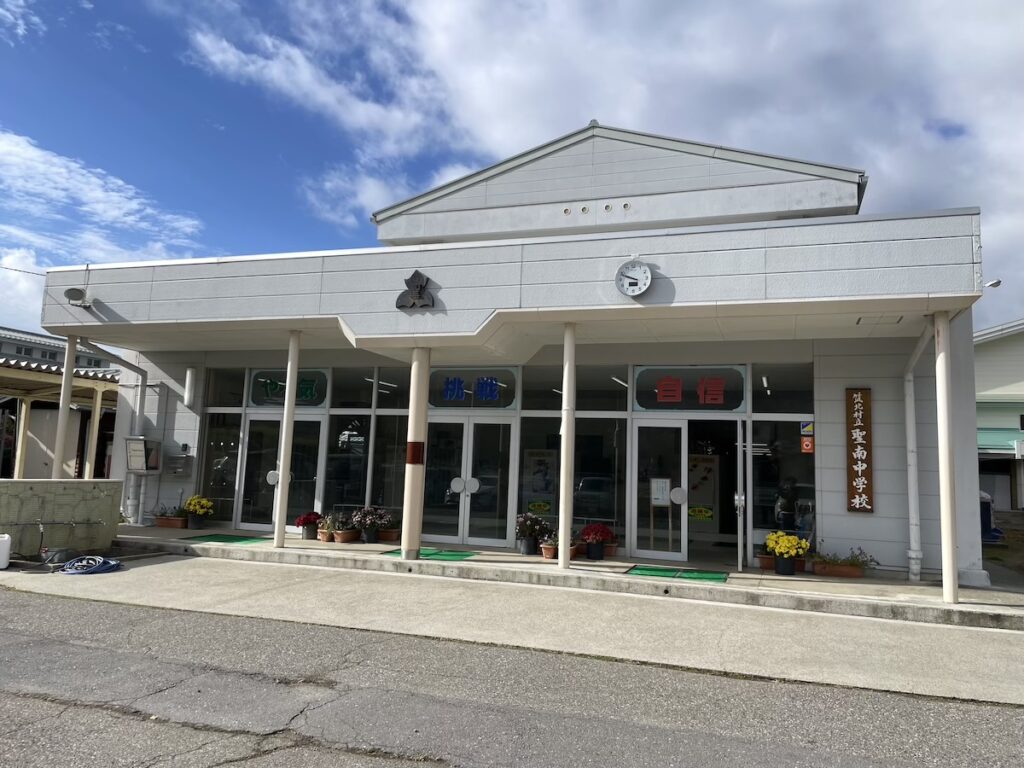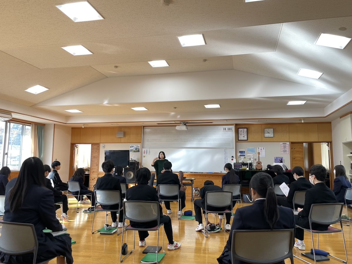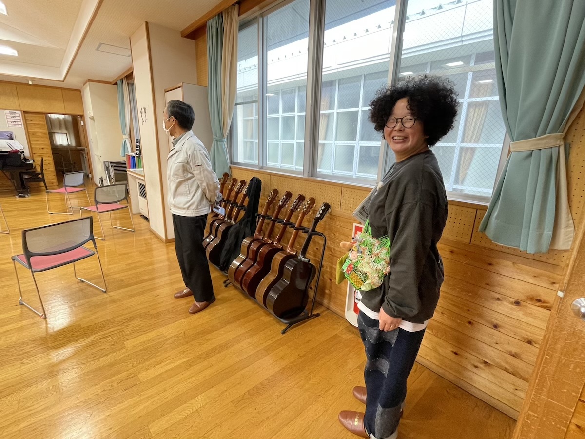 その前に、筑北村内にある聖南中学校へ。先日の筑北村商工祭のオークションで落札いただいた西森先生から、「中学校でギターの授業がある」とお伺いしたので、ぜひ見学させていただく事に。