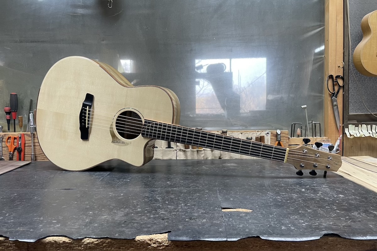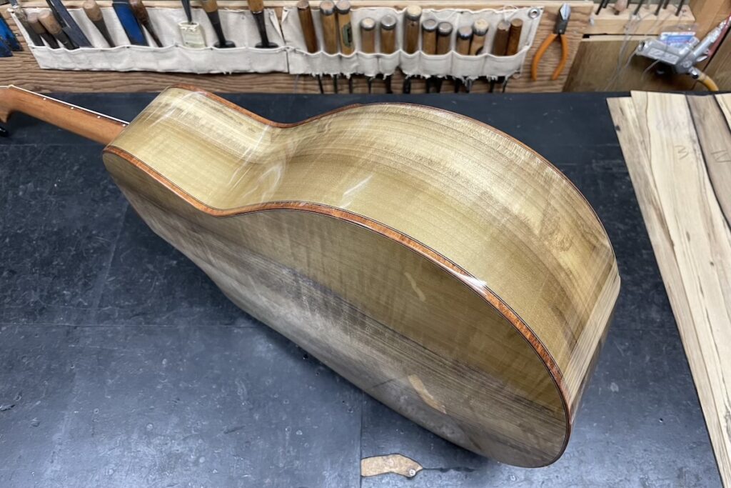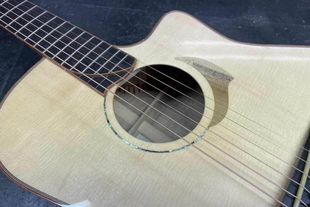 美しいベアクロウの入ったジャーマンスプルースをトップに、バック&サイドには稀少な朴(ほお)材を採用しました。しかも、フレイムのびっしり入ったプレミアムグレードの材料です。