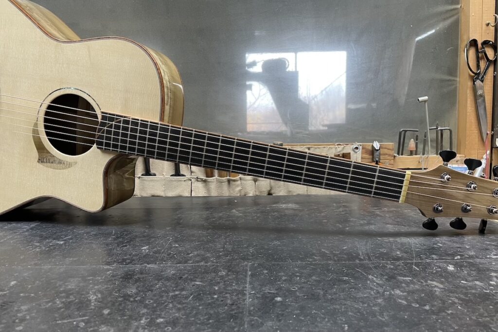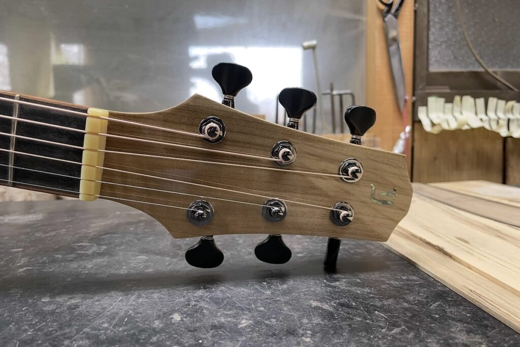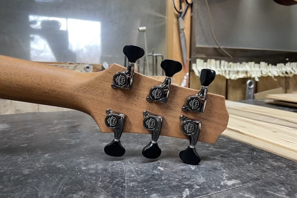 指板&ブリッジ駒にはエボニー、バインディングには、こちらも稀少なフレイムマホガニー。ヘッドトップ、ロゼッタには、朴材を合わせています。