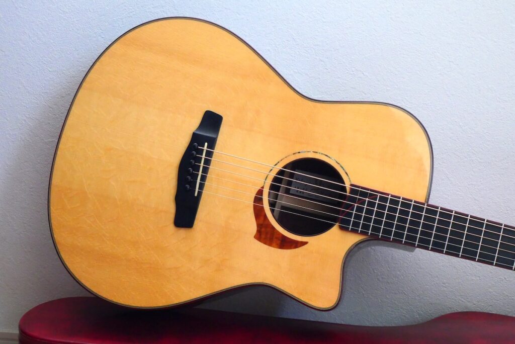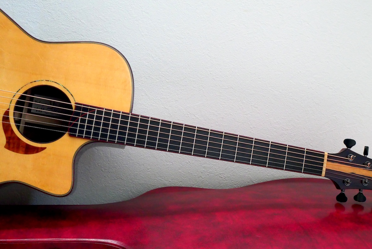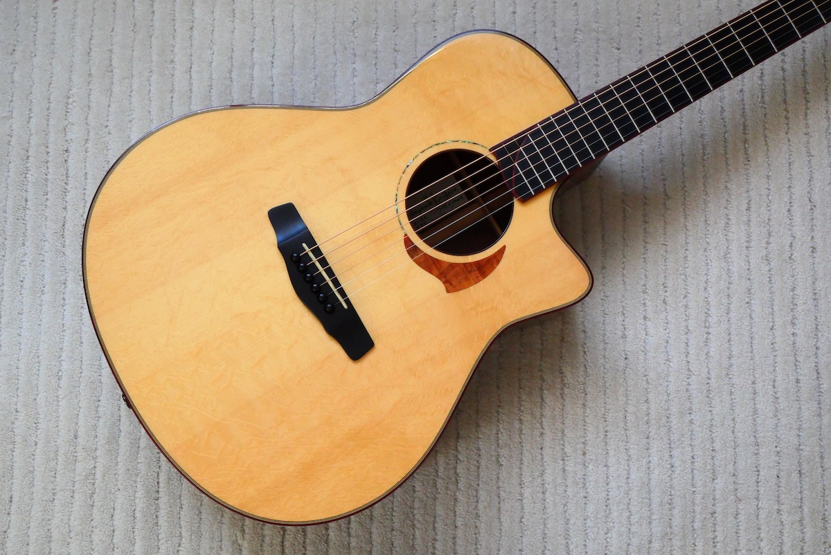 ボディトップは、美しいベアクロウの入ったジャーマンスプルース、ボディバック&サイドはカマティロです。バック材は、杢目の美しい貴重な2ピースバックが採用されています。