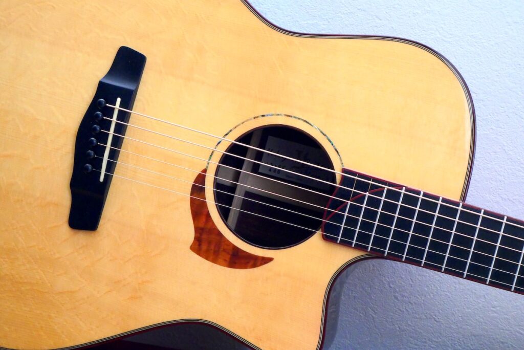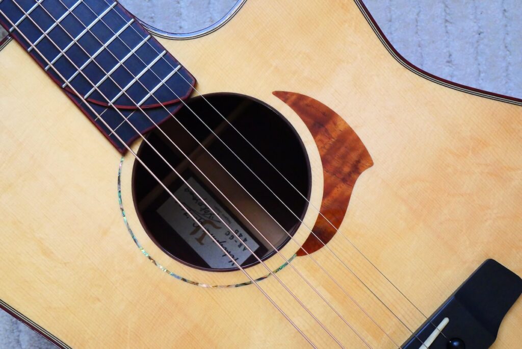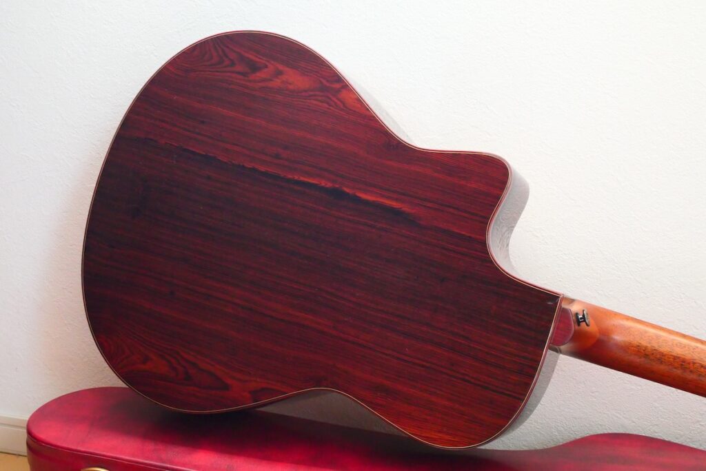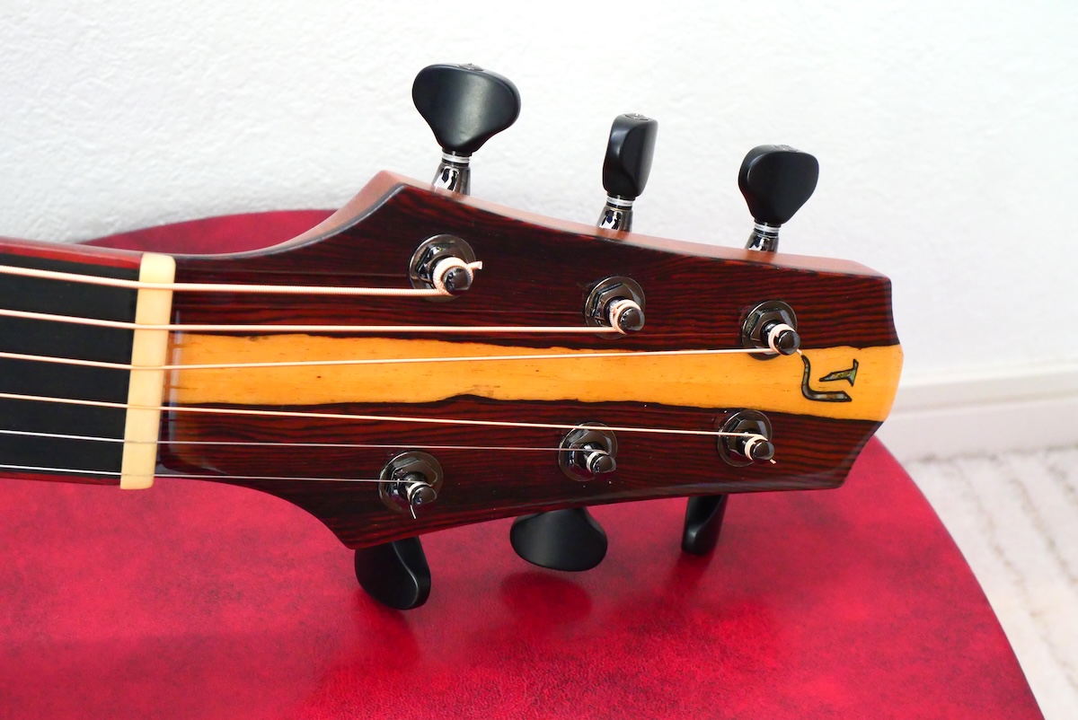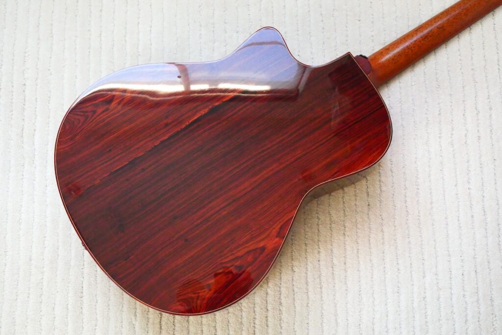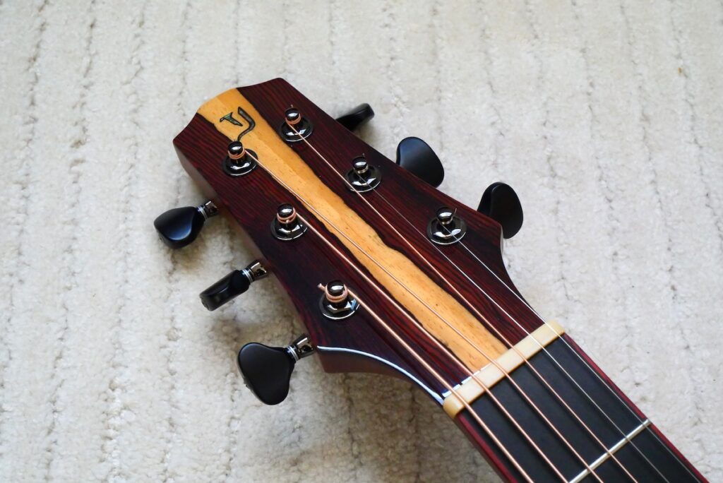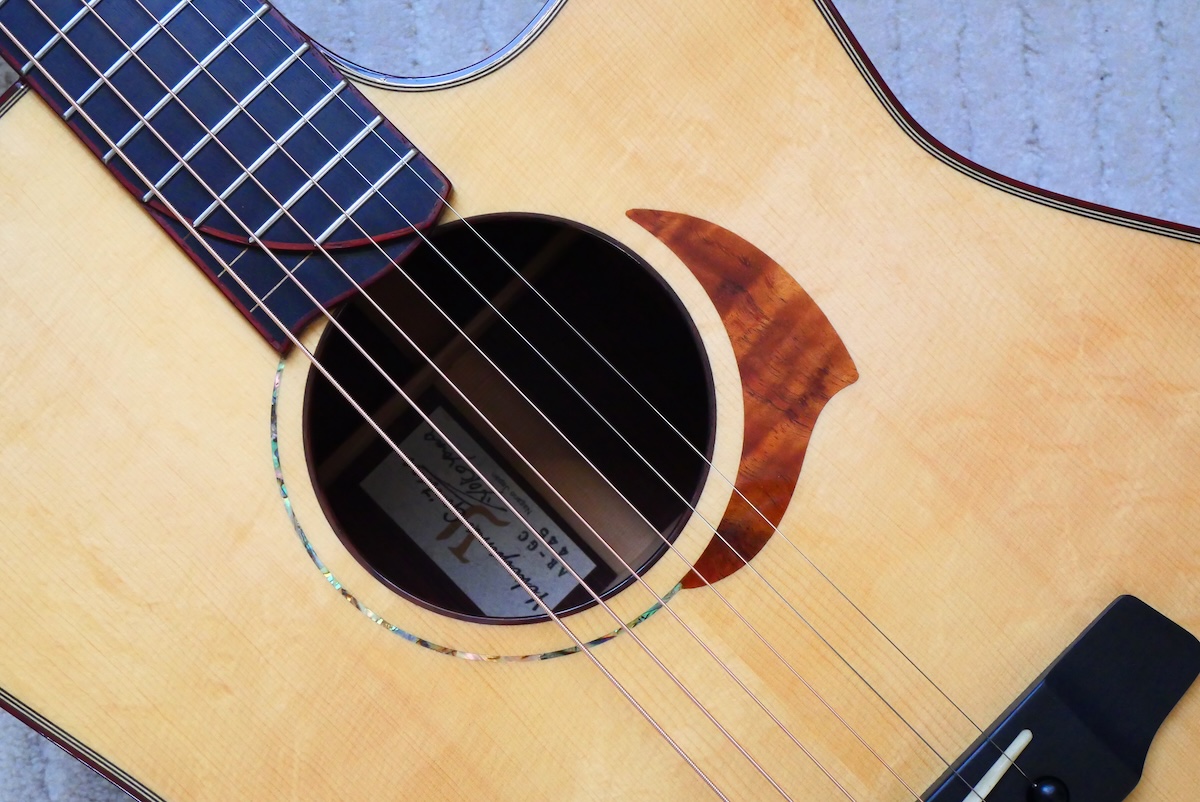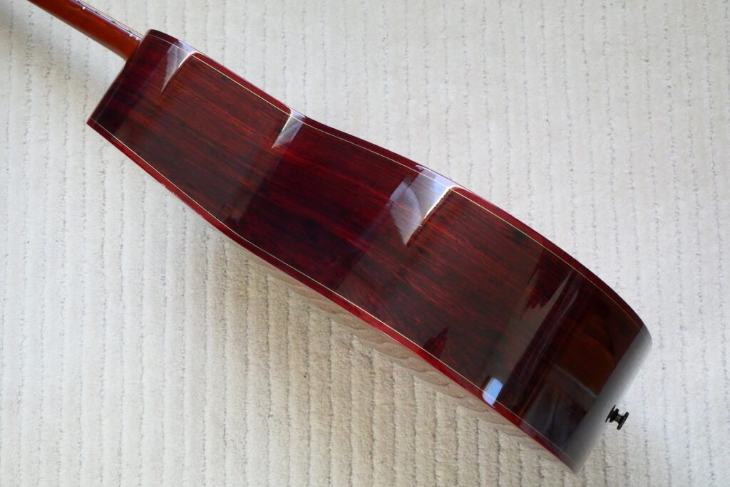ヘッド天神板にはサップの入ったカマティロ材、バインディングは赤味がかった色味が特徴的なパドックを採用しています。しかも、サウンドホールインナーにもローズウッドが巻かれています。