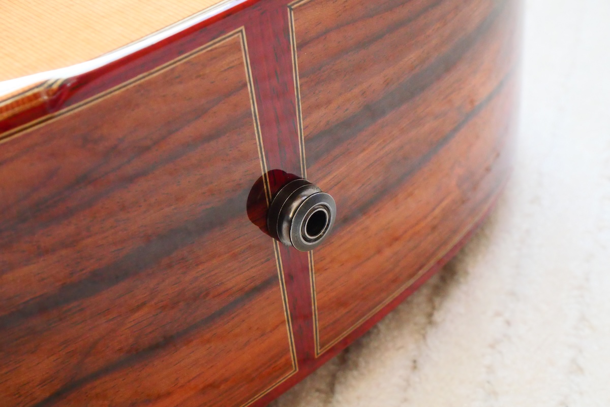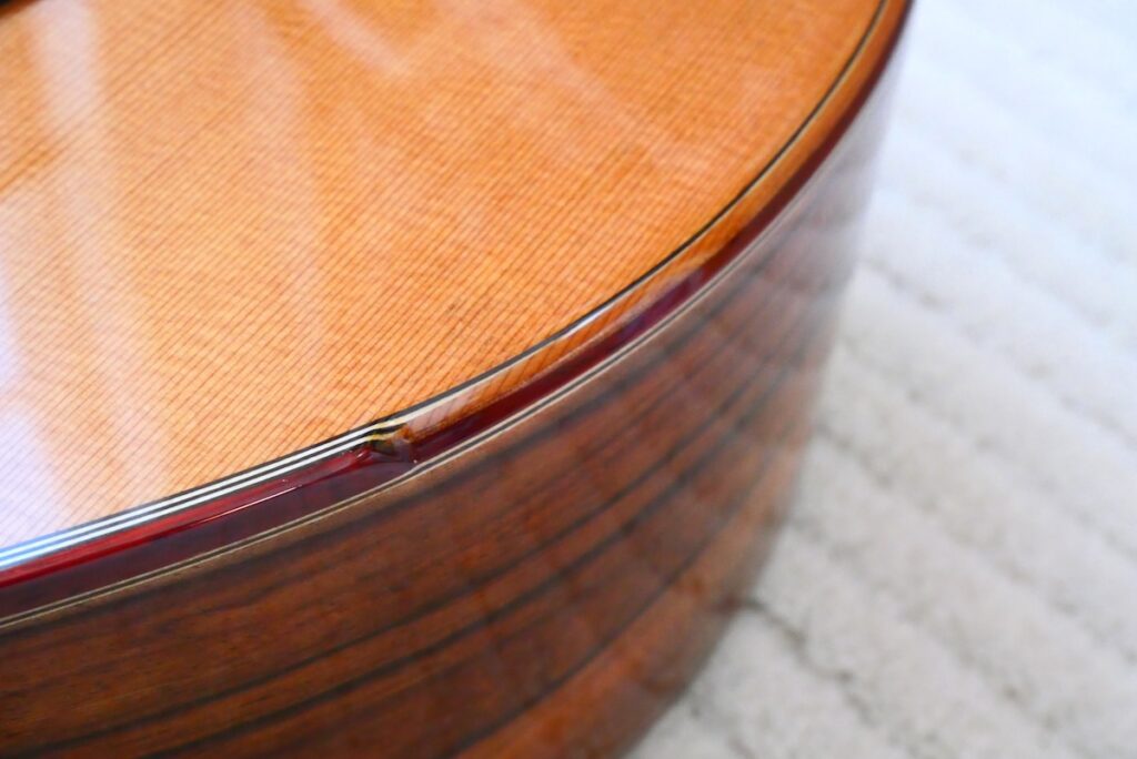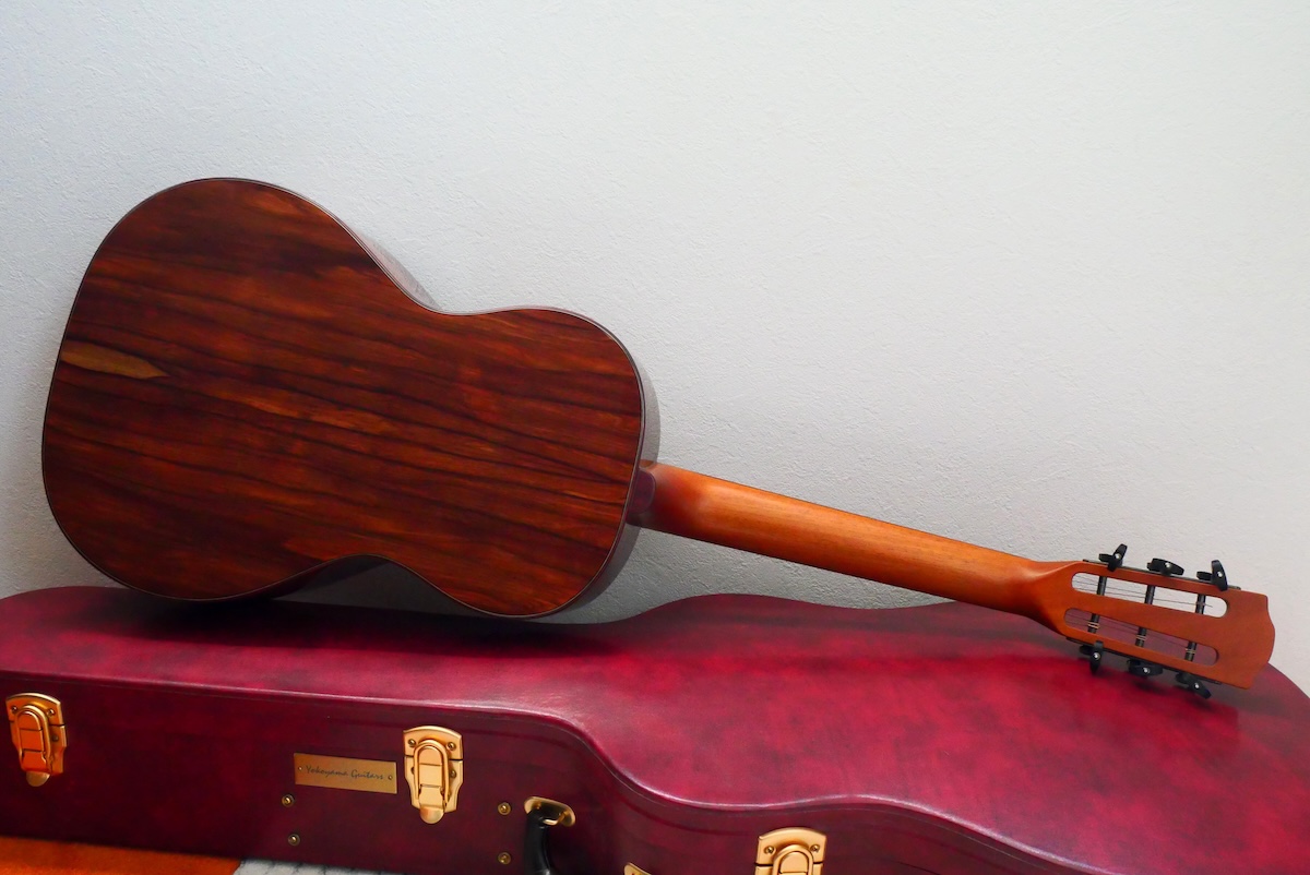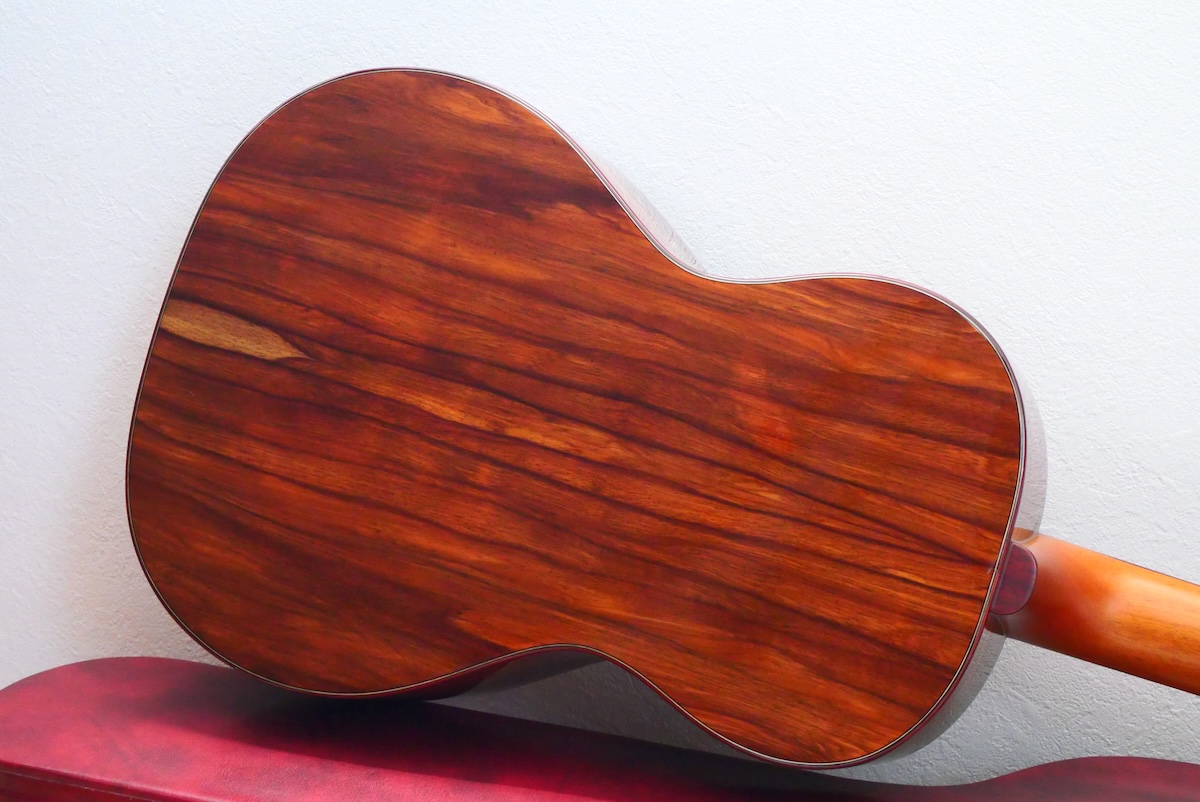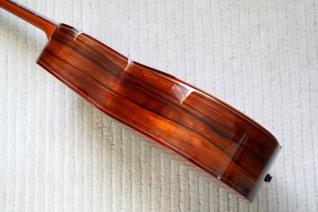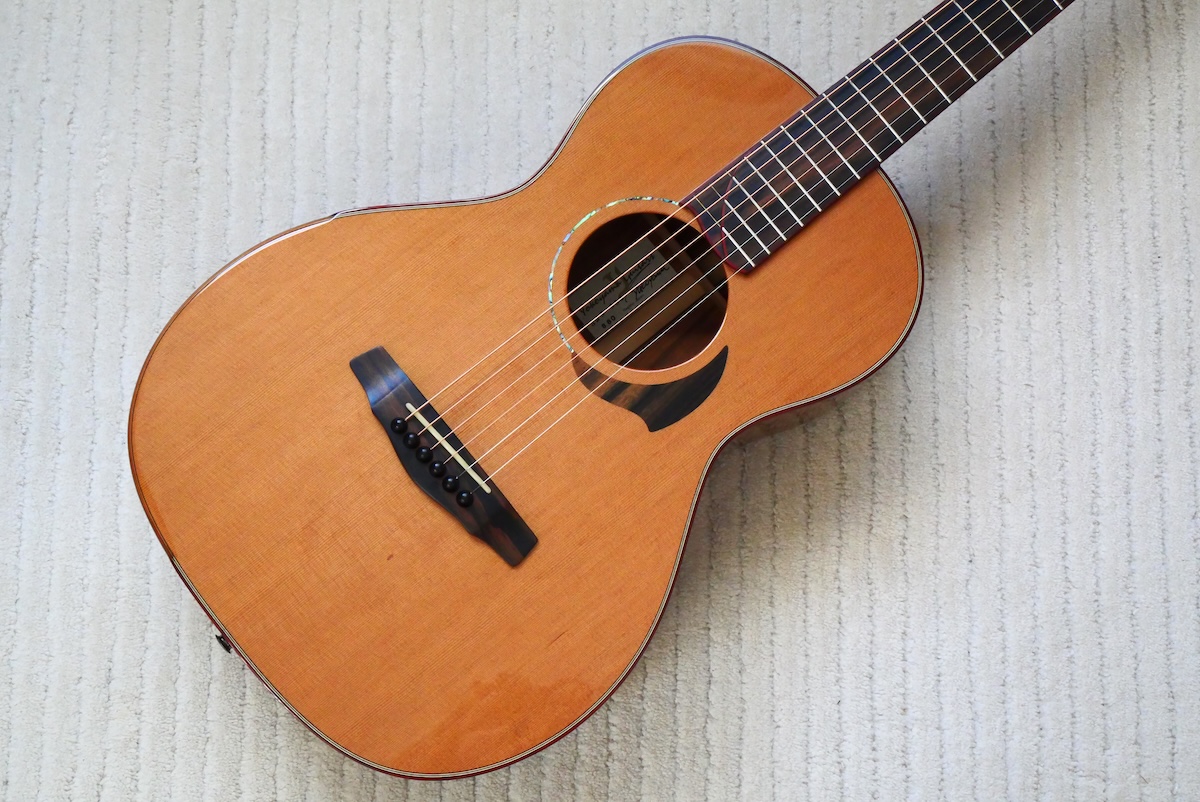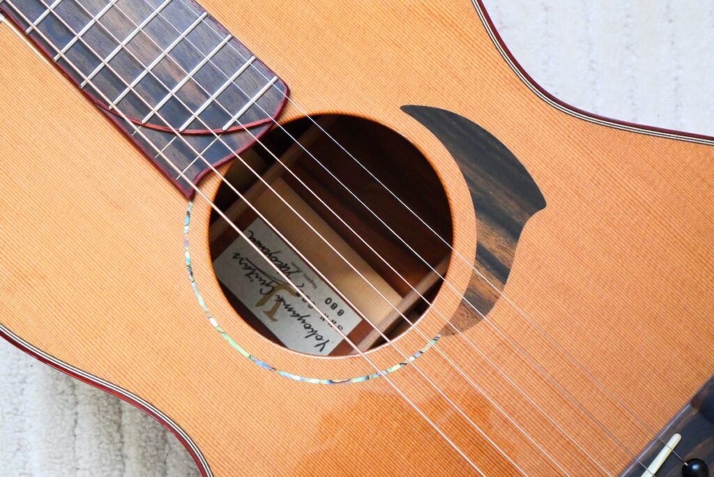 ボディトップには工房立ち上げ当初からストックしている、極上のレッドシダー、バック&サイド材には貴重なサチャローズウッドを採用しています。サチャローズウッド自体、インパクトのある杢ですが、柔らかく、ふくよかなサウンドが特徴的です。