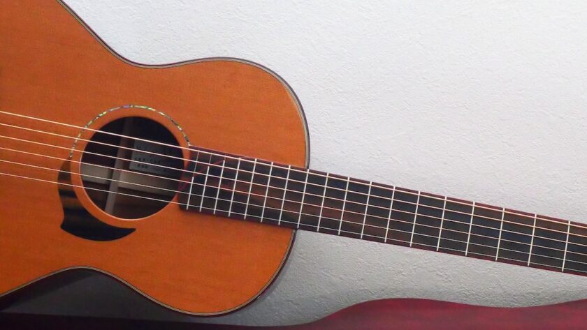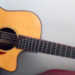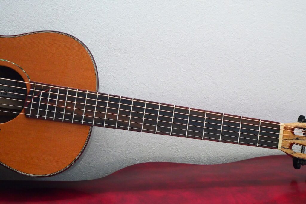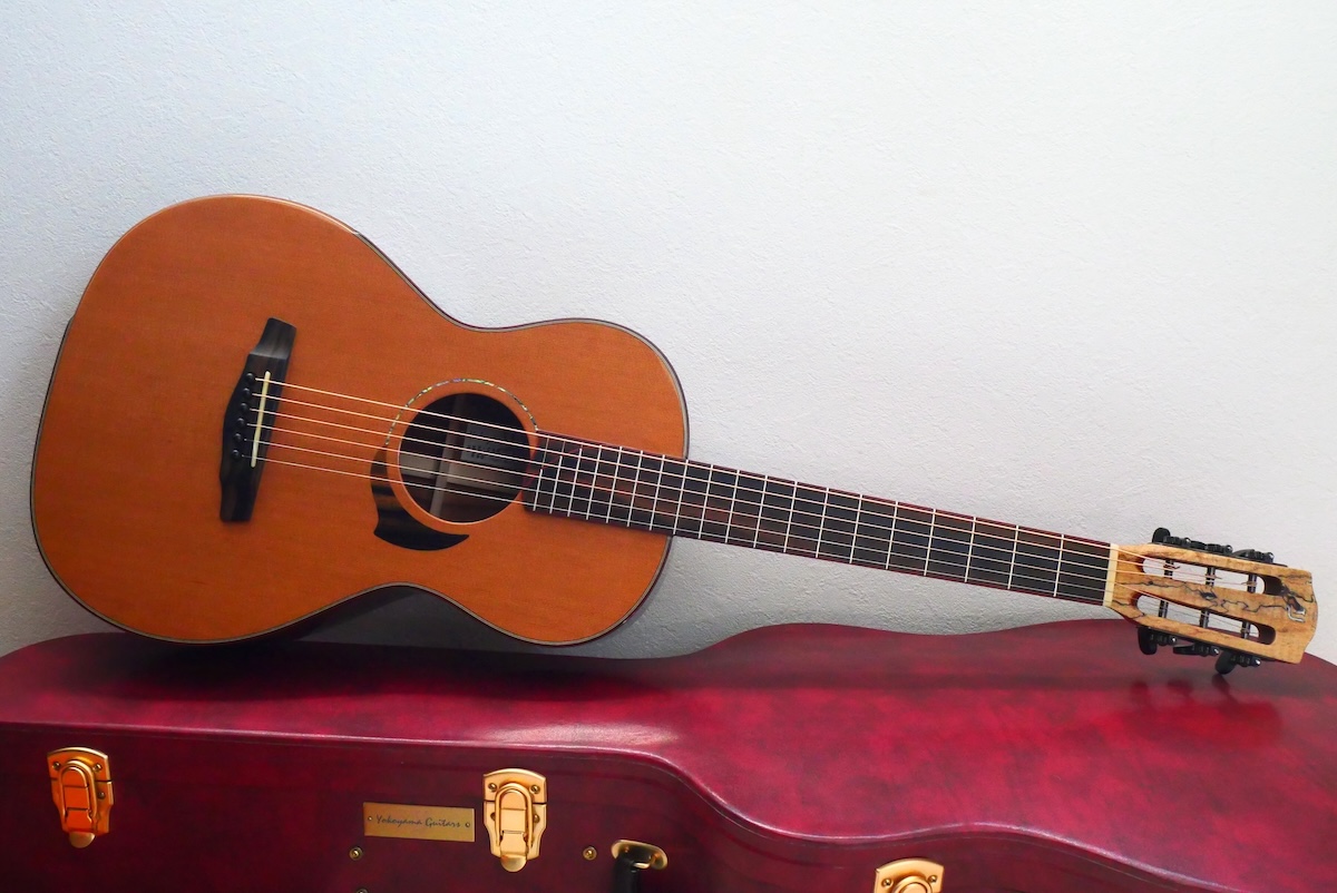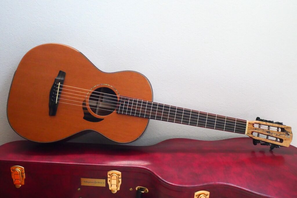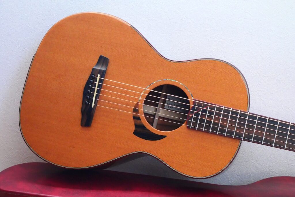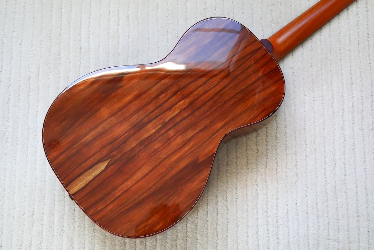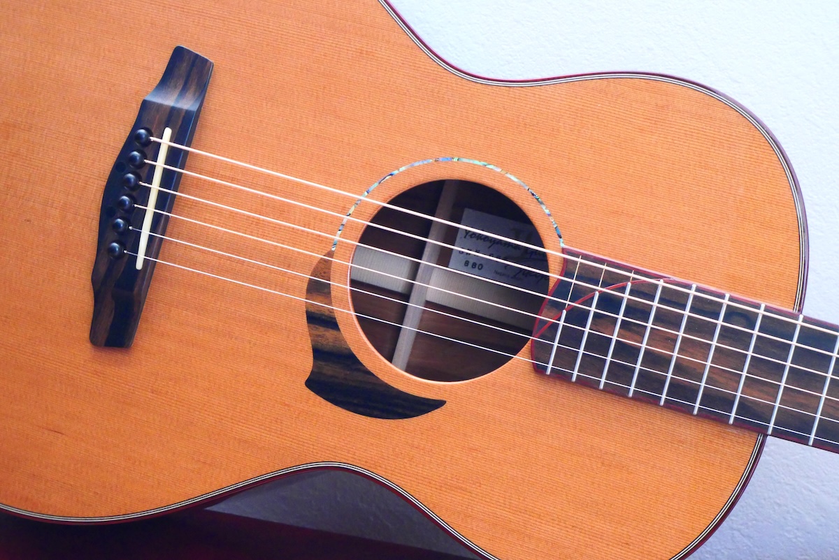 ボディトップには工房立ち上げ当初からストックしている、極上のレッドシダー、バック&サイド材には貴重なサチャローズウッドを採用しています。サチャローズウッド自体、インパクトのある杢ですが、柔らかく、ふくよかなサウンドが特徴的です。