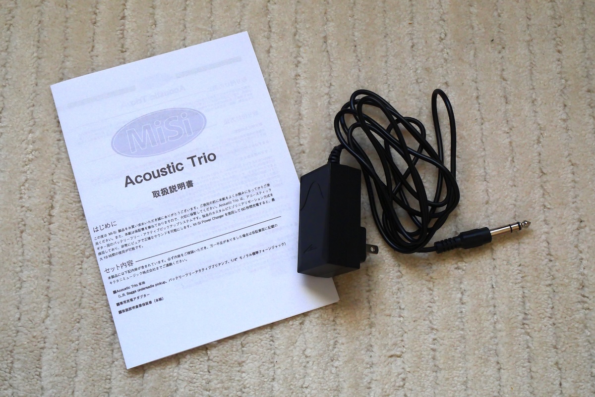 ご購入時に、当工房にてピックアップを取り付けさせていただきました(MiSi Acoustic Trio)。ピエゾピックアップですが、ボディ内部に電池が要らず、充電式のため、ピックアップ非搭載モデルと比べて、重さや鳴りの変化などを感じにくく、とても人気があります。