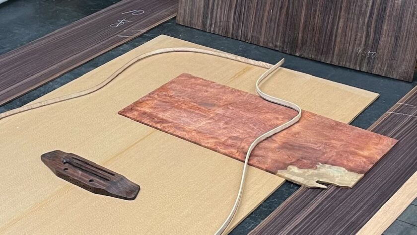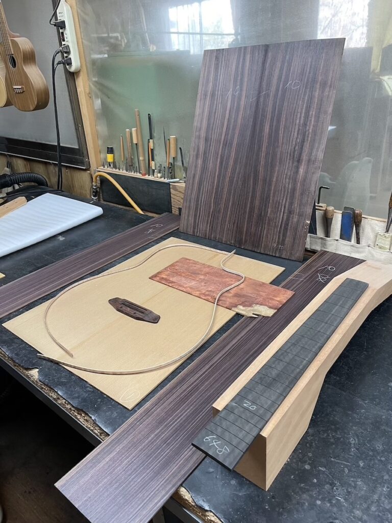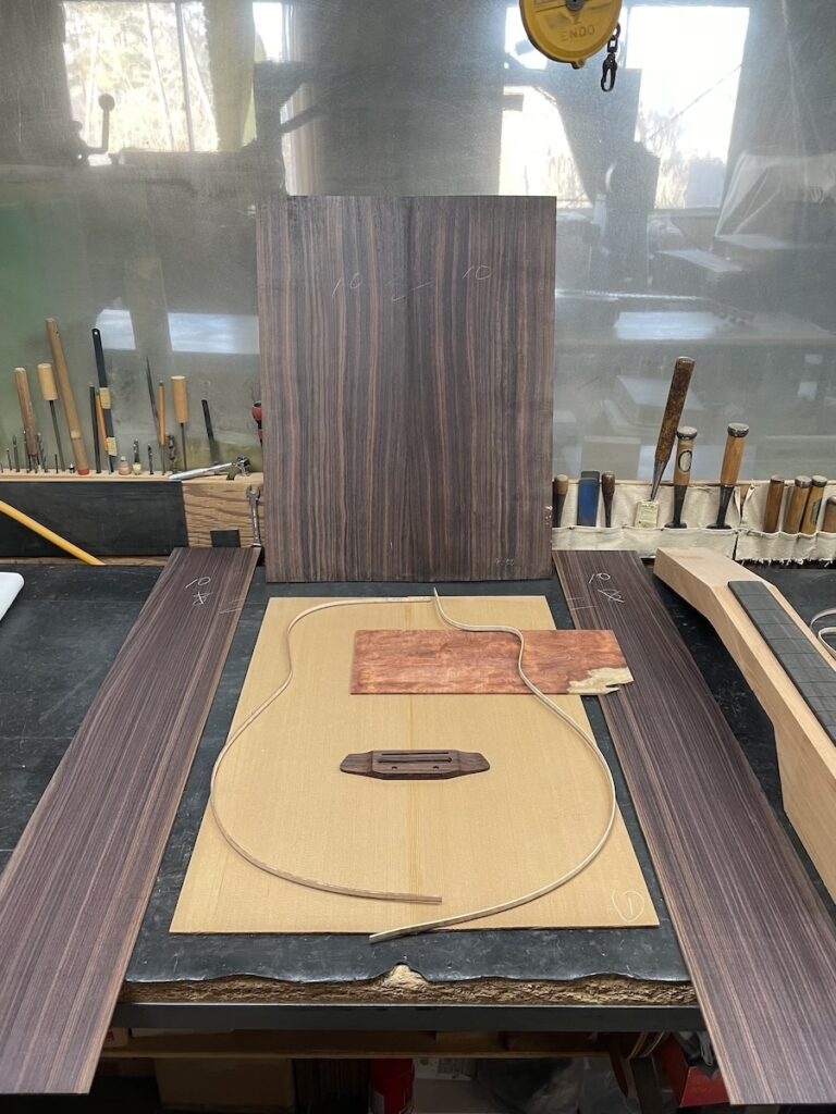 ボディ材は、シダートップ、インディアンローズウッドバック&サイドに決定です。完成までお時間をいただきますが、楽しみにお待ちください!