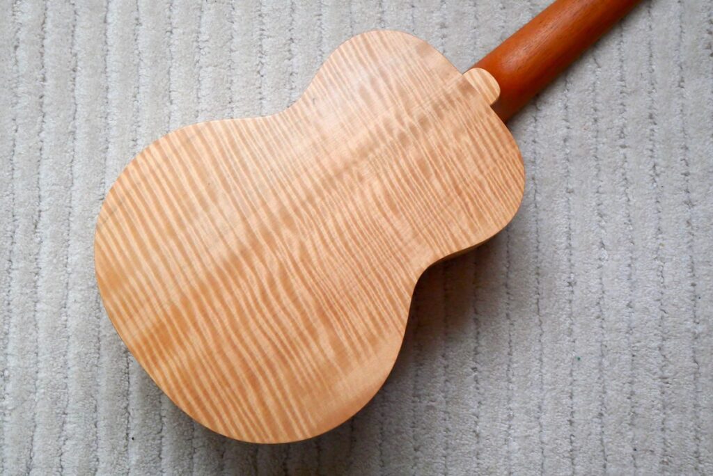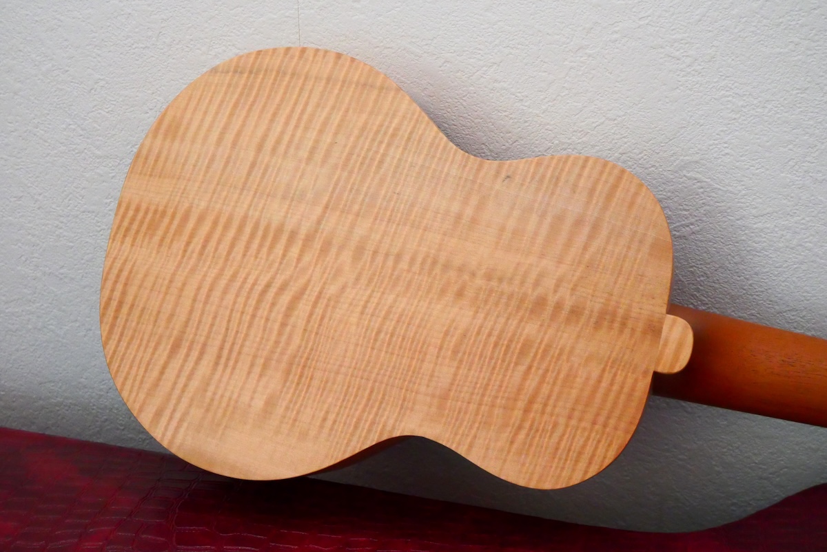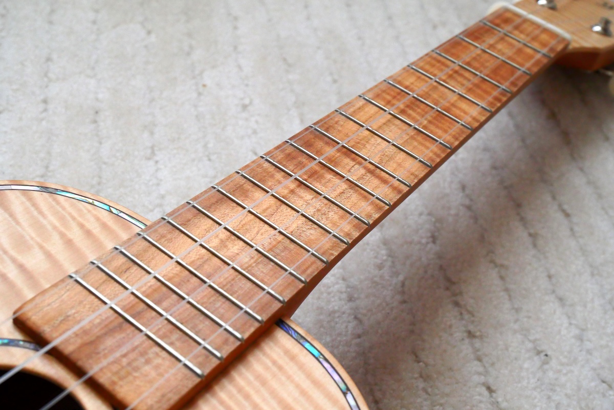 ネックはマホガニー、ヘッド天神にはボディ同様のとち材を採用しました。指板と駒には、こちらも美しい杢の入った、奥多摩産のもみぢをチョイス。