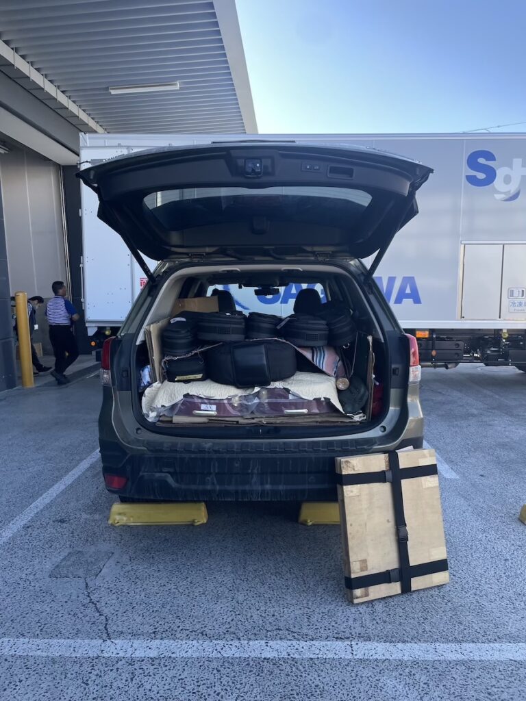 会場のイオンモール松本まで、工房から車で一時間弱。当日の朝に搬入します。