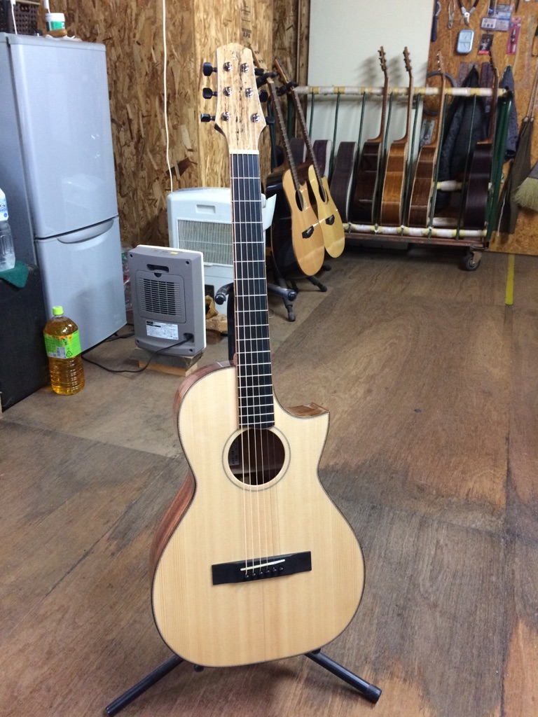 ヘッドこそノーマルヘッドで、カッタウェイ仕様でしたが、12フレットジョイント&628mmスケールを採用。ブリッジ形状もレキュタンギュラー風に改良、デザインもシンプルに仕上げました。細かいことを言うとボディシェイプ、厚みもカスタムしています。