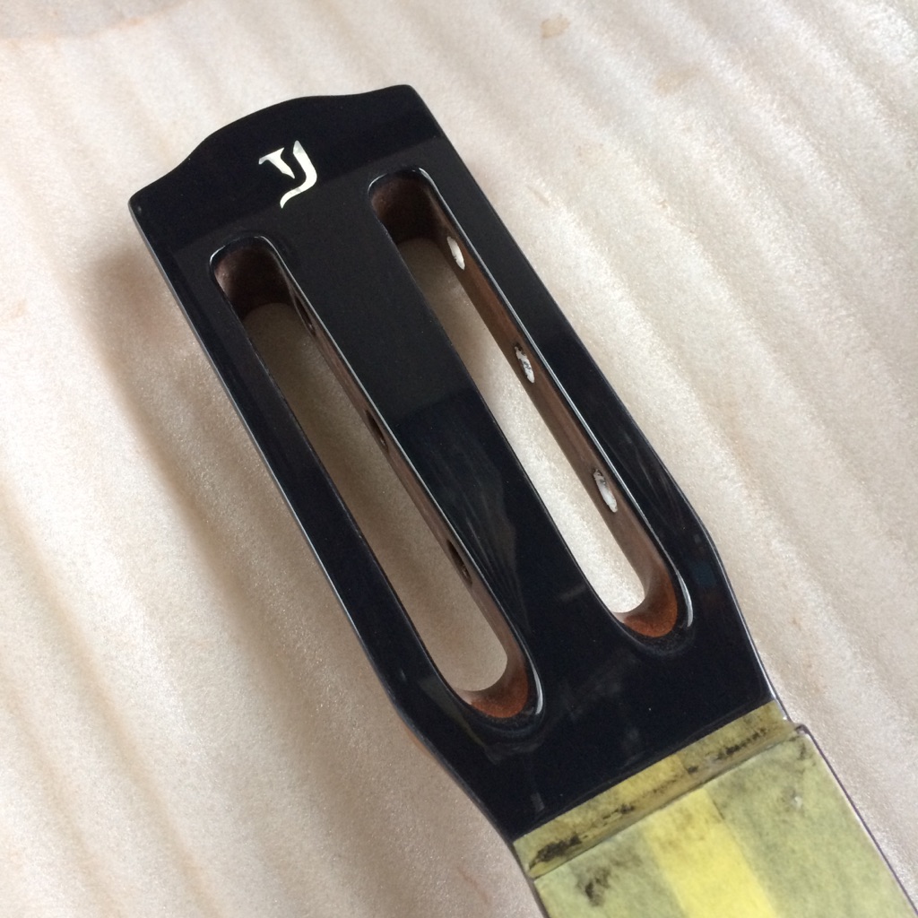 製作当時はほとんどがYokoyama Guitarsのノーマルヘッドを採用していましたが、やはりニューヨーカーと言えばスローテッドヘッド。スケールも通常の648mmではなく628mm、12フレットジョイントでしょうと。