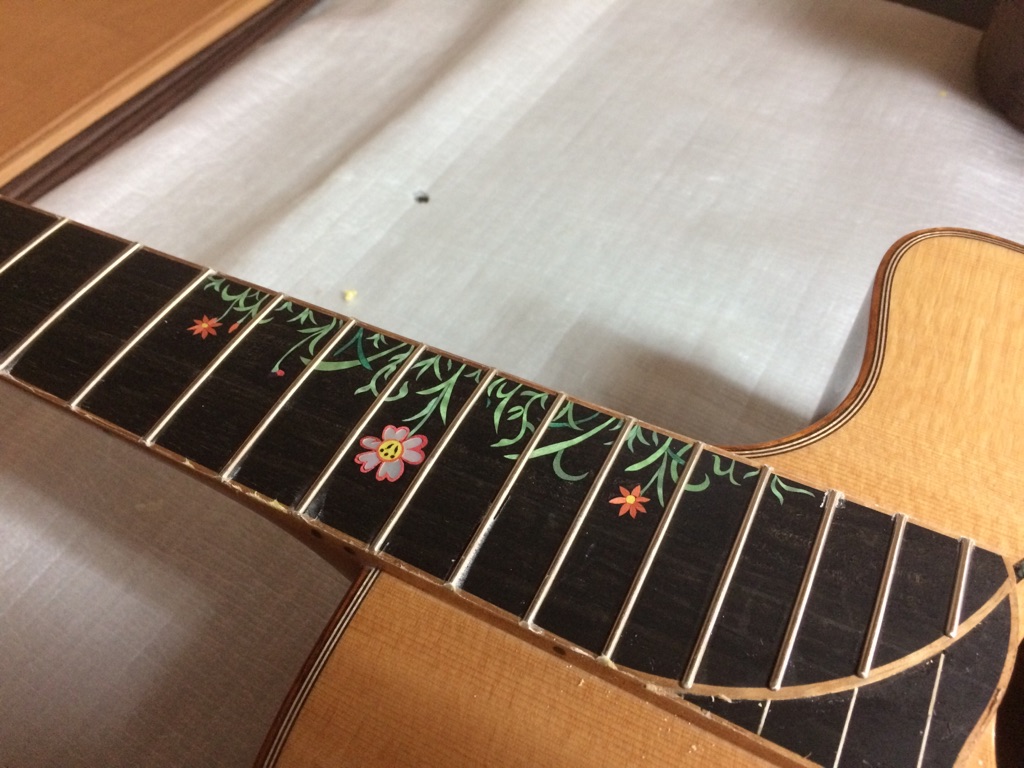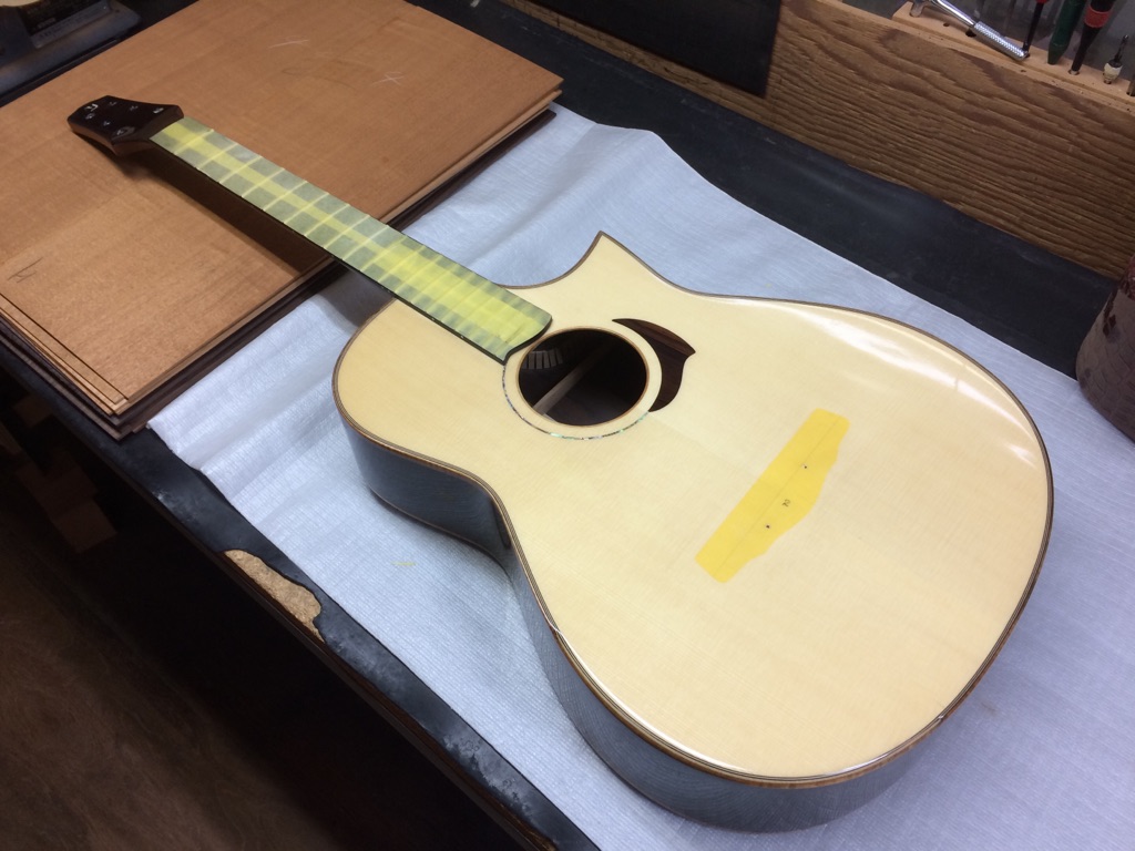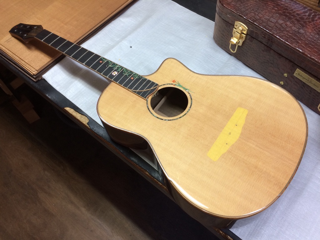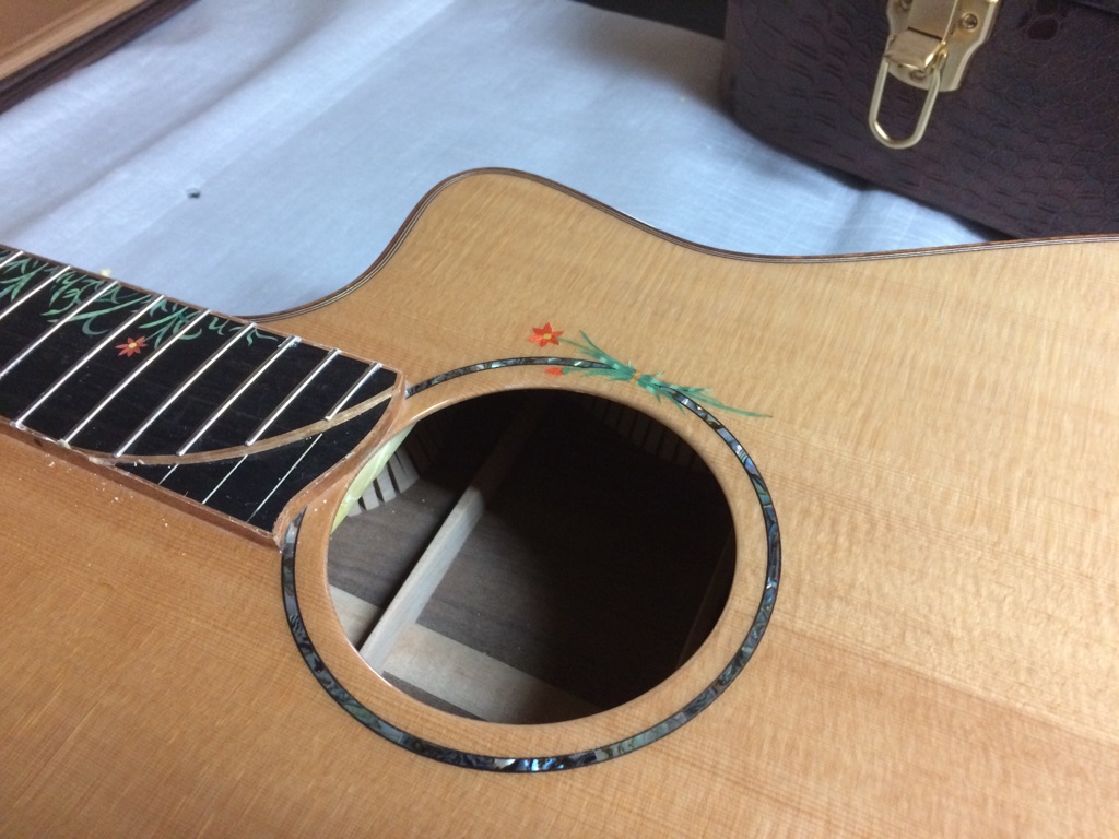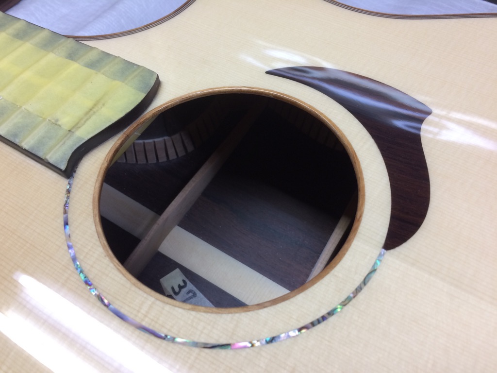 ボディの内部を見れるのもオーダーならではです。これにてボディトップのブレーシングは見納め。M様はインレイオーダーもされているので、オガワインレイクラフト 小川さんにも現在作業していただいています。