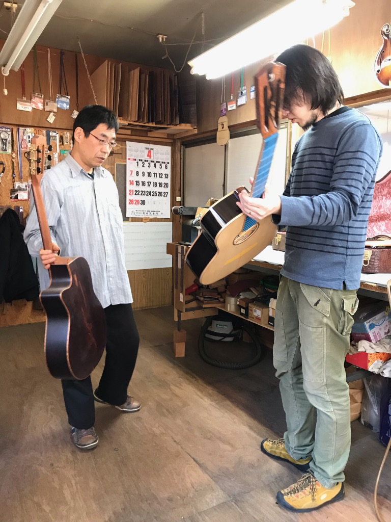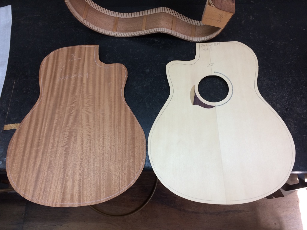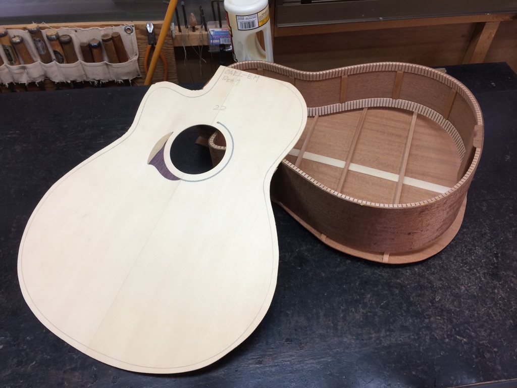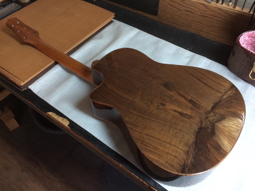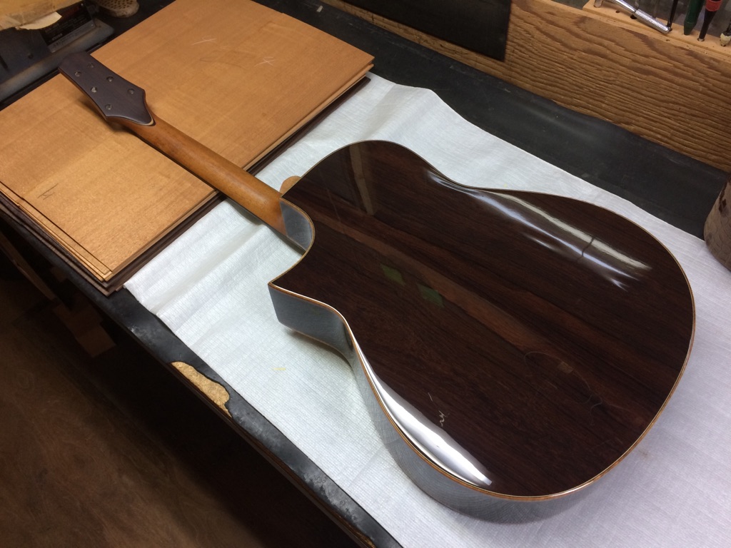 ボディの内部を見れるのもオーダーならではです。これにてボディトップのブレーシングは見納め。M様はインレイオーダーもされているので、オガワインレイクラフト 小川さんにも現在作業していただいています。