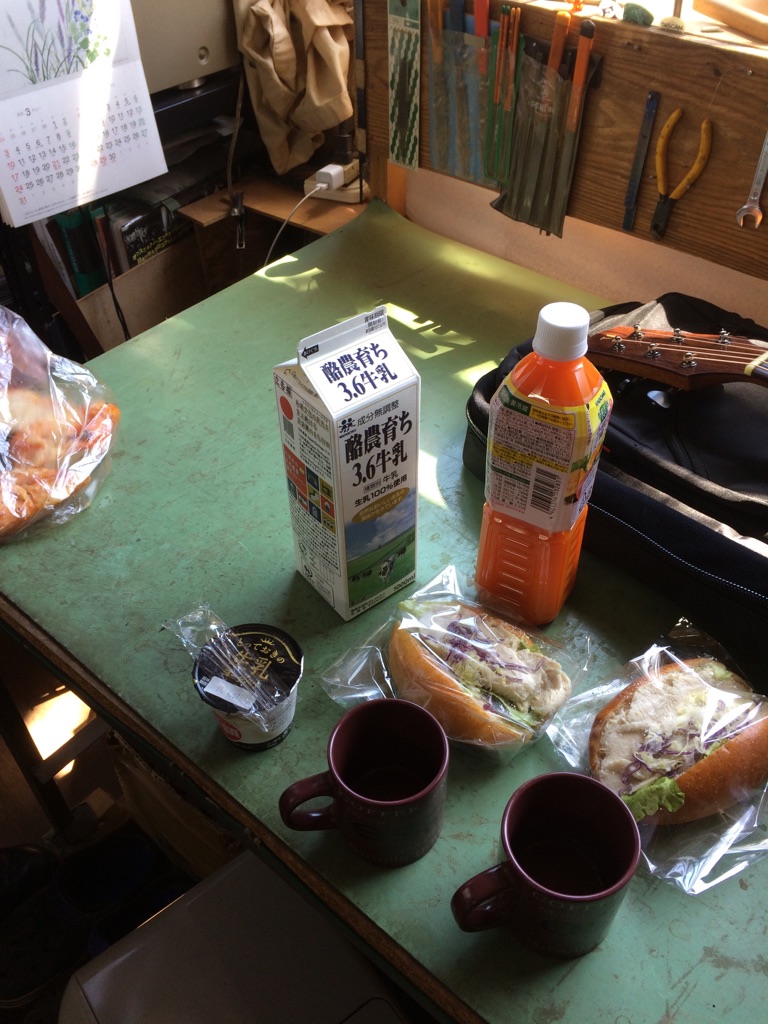 車で「ちくほっくる」まで買い出しに行ってきて、工房でいただきます。