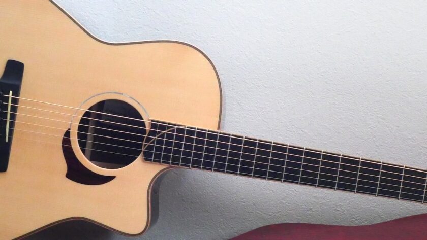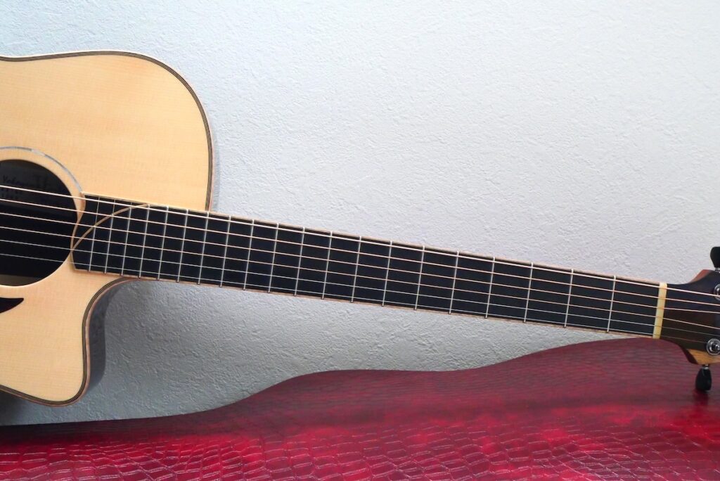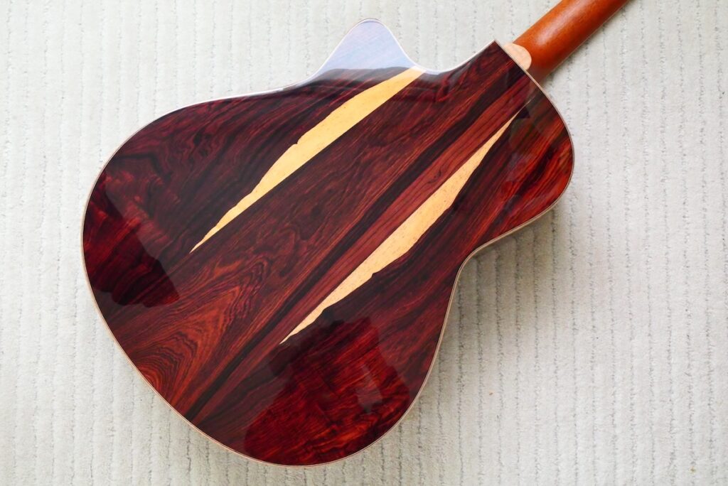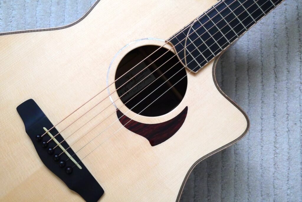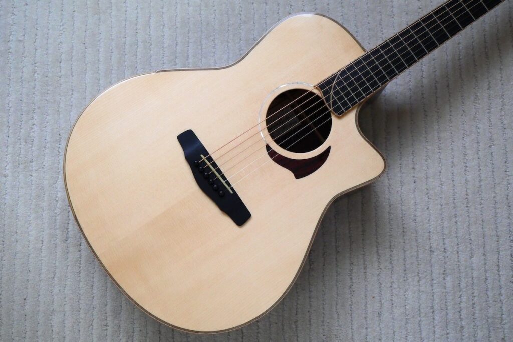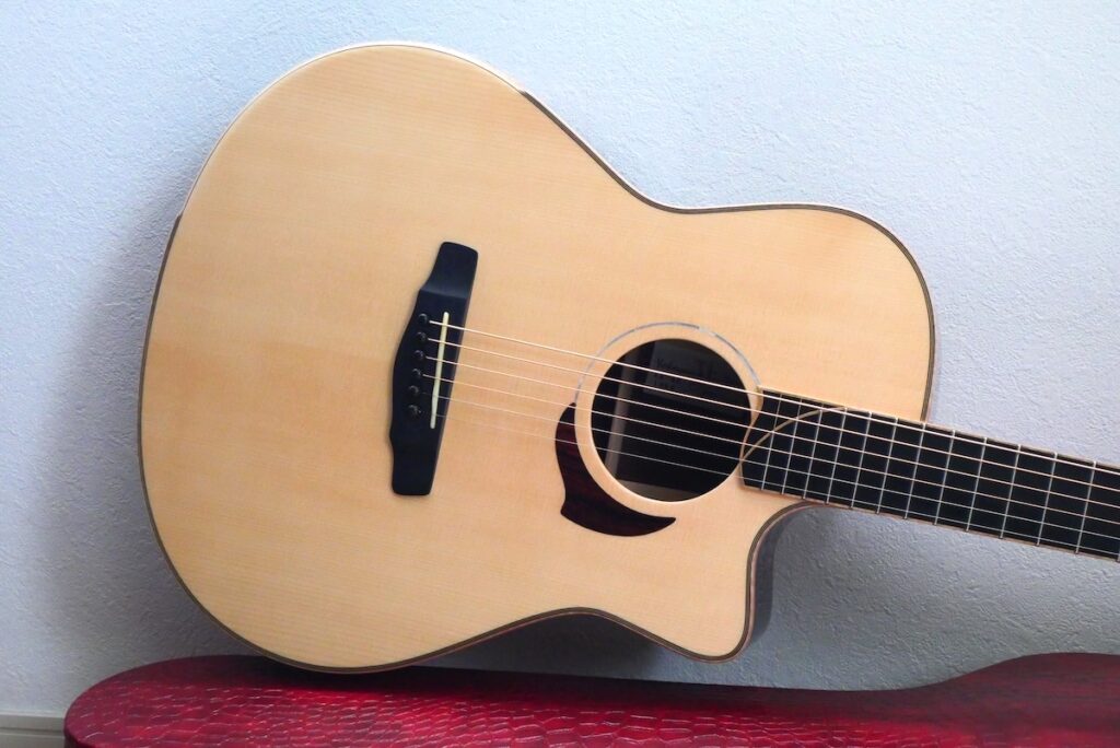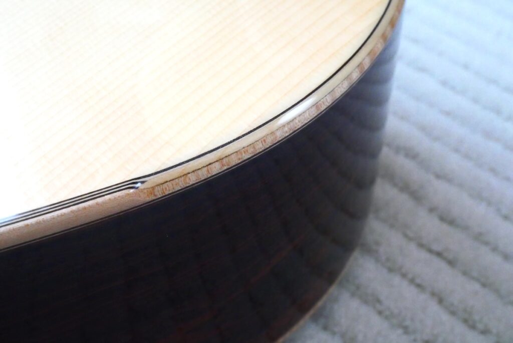 トップには美しいプレーンのジャーマンスプルースをセレクトし、バック&サイド材にはサップの入った、杢の美しいカマティロ材を採用しています。
