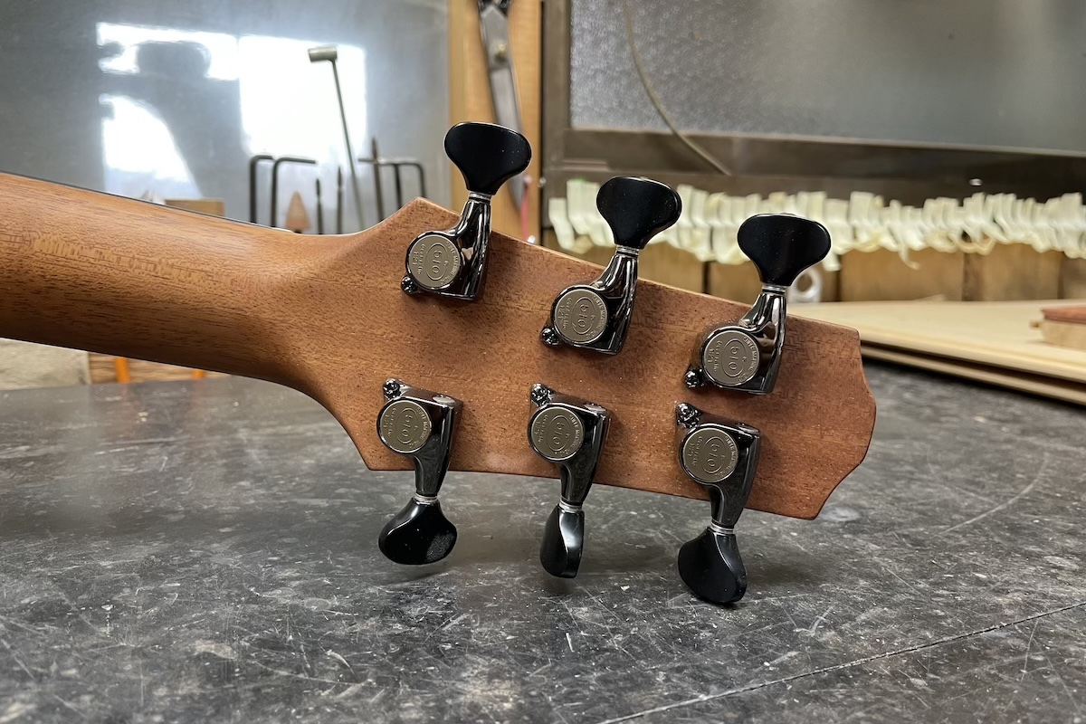 指板&ブリッジ駒にはエボニー、バインディングには、ベッコウ柄のセルを採用しています。ヘッドトップはけやき材を合わせています。