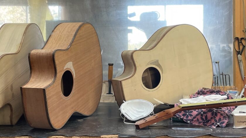 トップ材には、こちらも長年工房で寝かせていたホワイトスプルース。ロゼッタ材には奥多摩産もみぢを採用しており、とても新鮮です。
