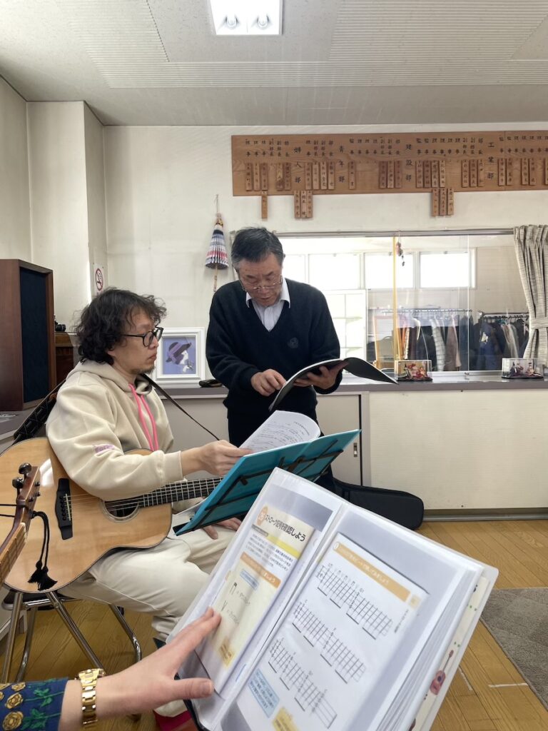 もちろん前山さん(大家さん)のハーモニカに合わせての演奏です。前山さん、演奏曲の打ち合わせに余念がありません。