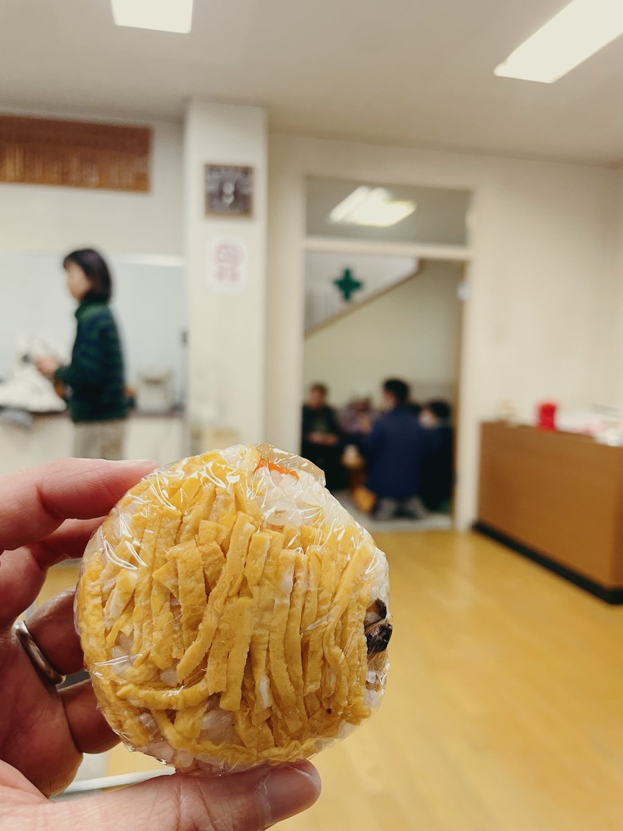 演奏後は、地元のお母さんたちに、おにぎりやお茶でおもてなしいただきました。おにぎり、美味しかったです。