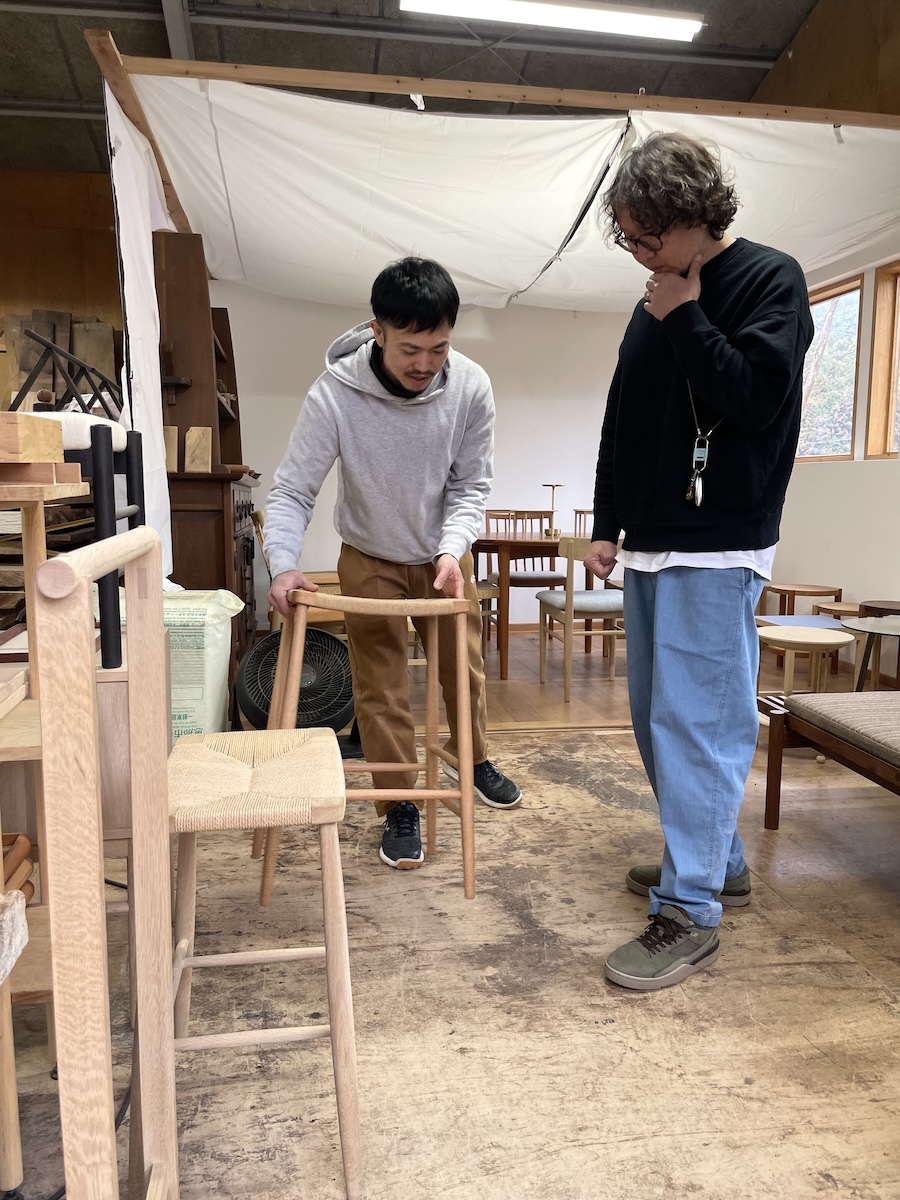 野亜さんと椅子の高さや、座面の奥行き、足掛けなどを相談。試作品をお願いすることができました。
