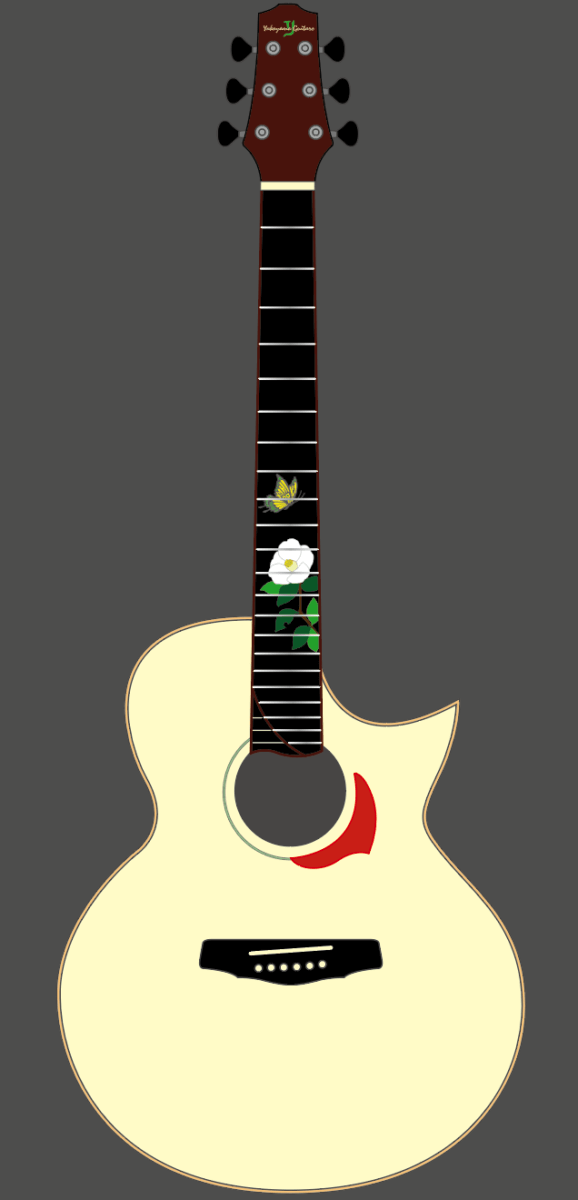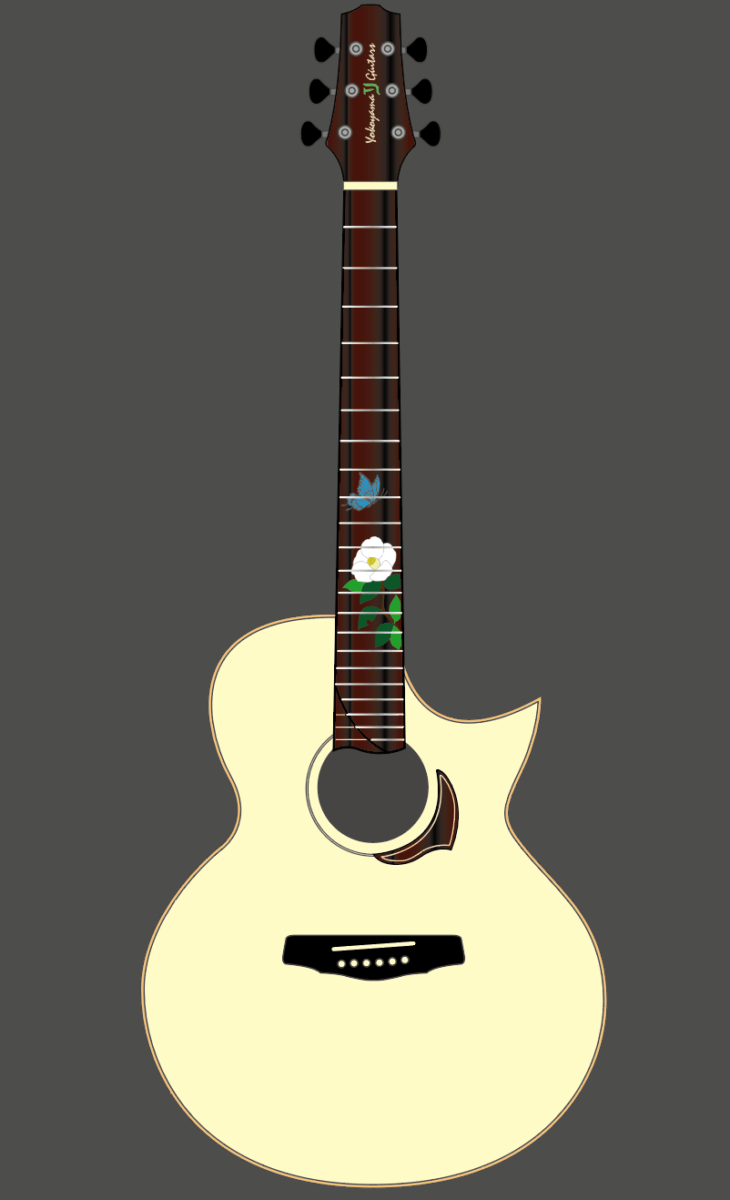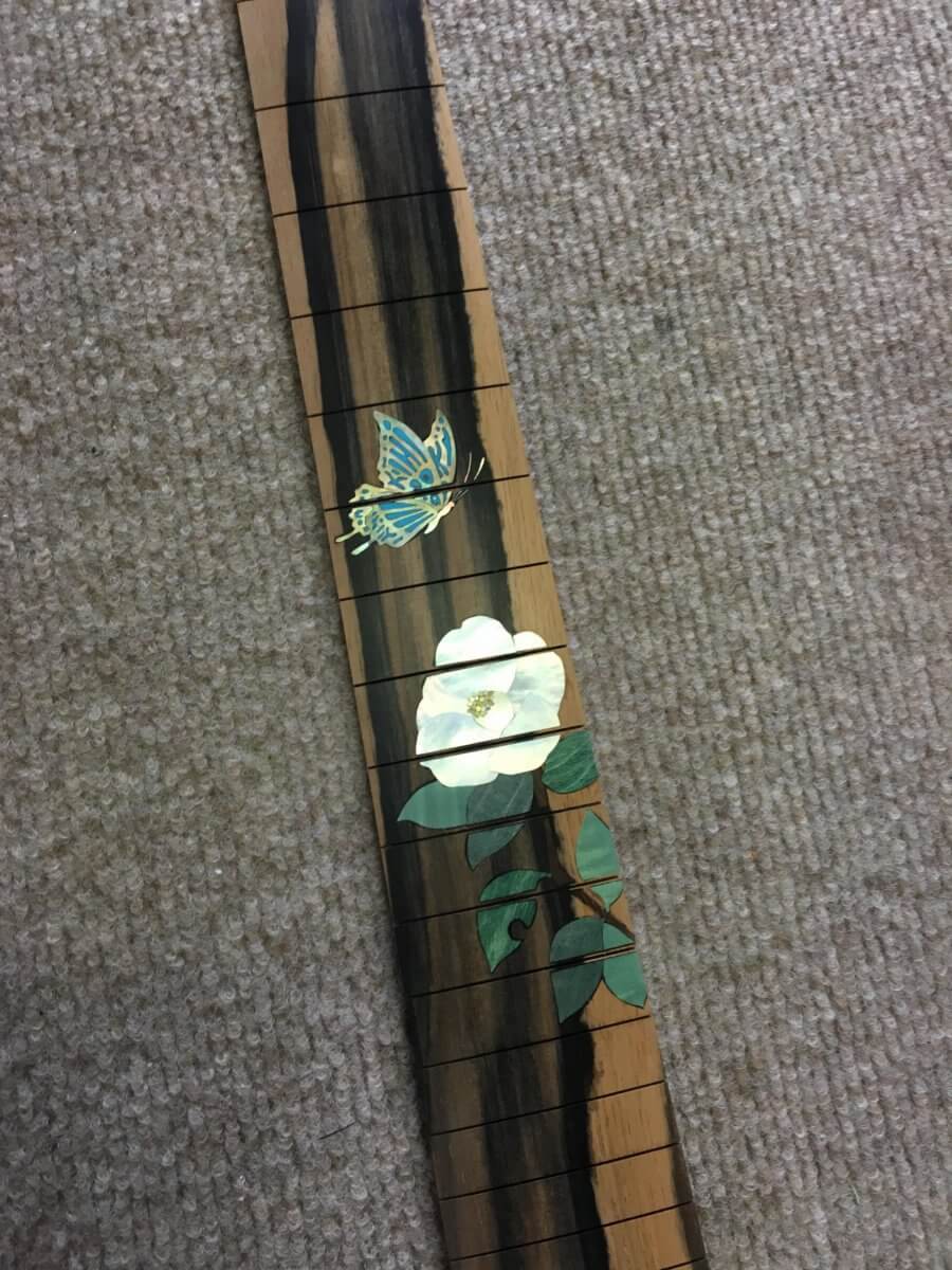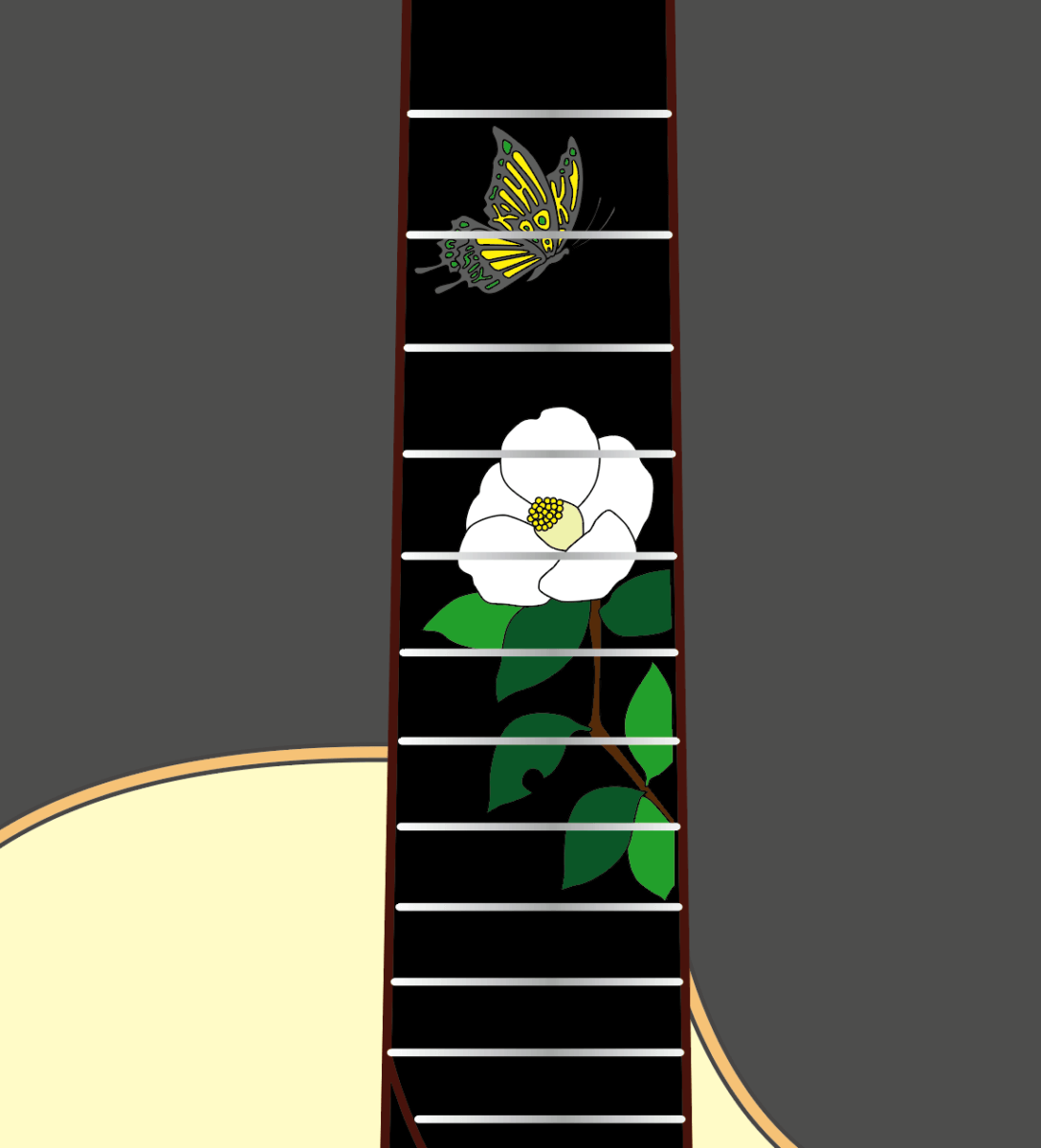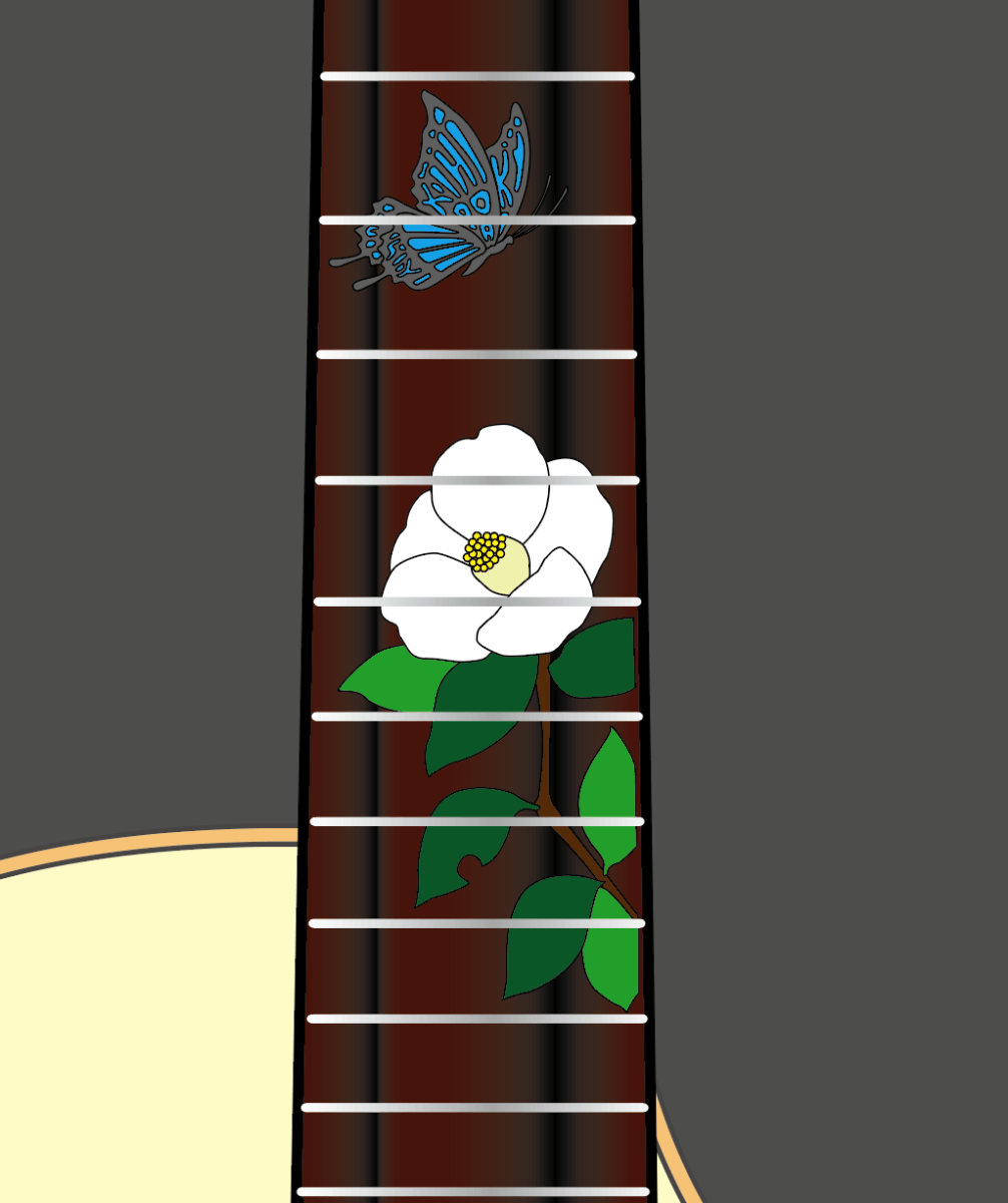 指板面のアップはこんな感じです。このイメージ画をもとにお客様のリクエストで、少しずつ修正してデザインを作成してくれます。実際に出来上がった指板は下記の様になります。