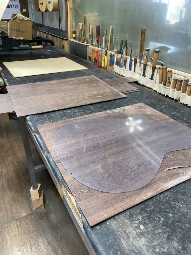 いらっしゃる前に、前回お選びいただいた「ブラジリアンローズウッド」を準備しておきました。まずはトップ材の選定からスタートです。