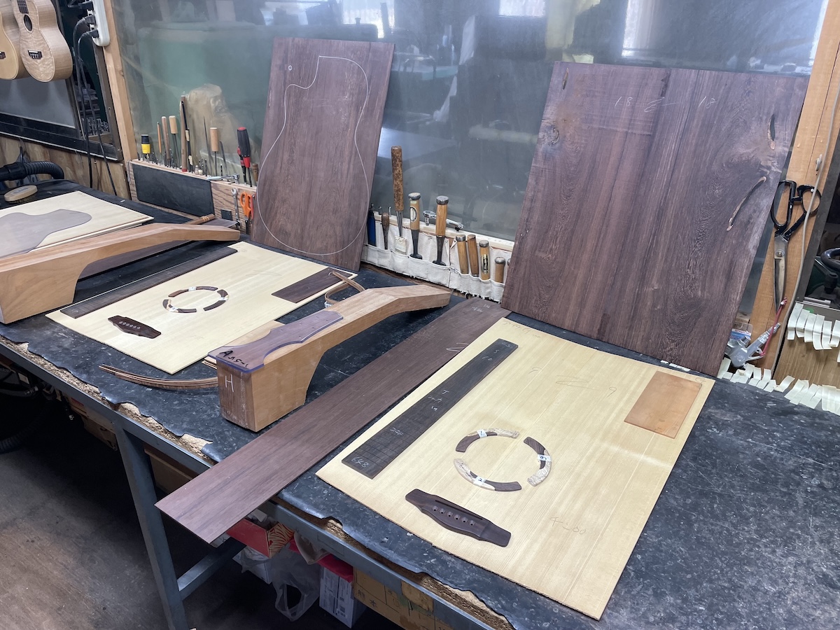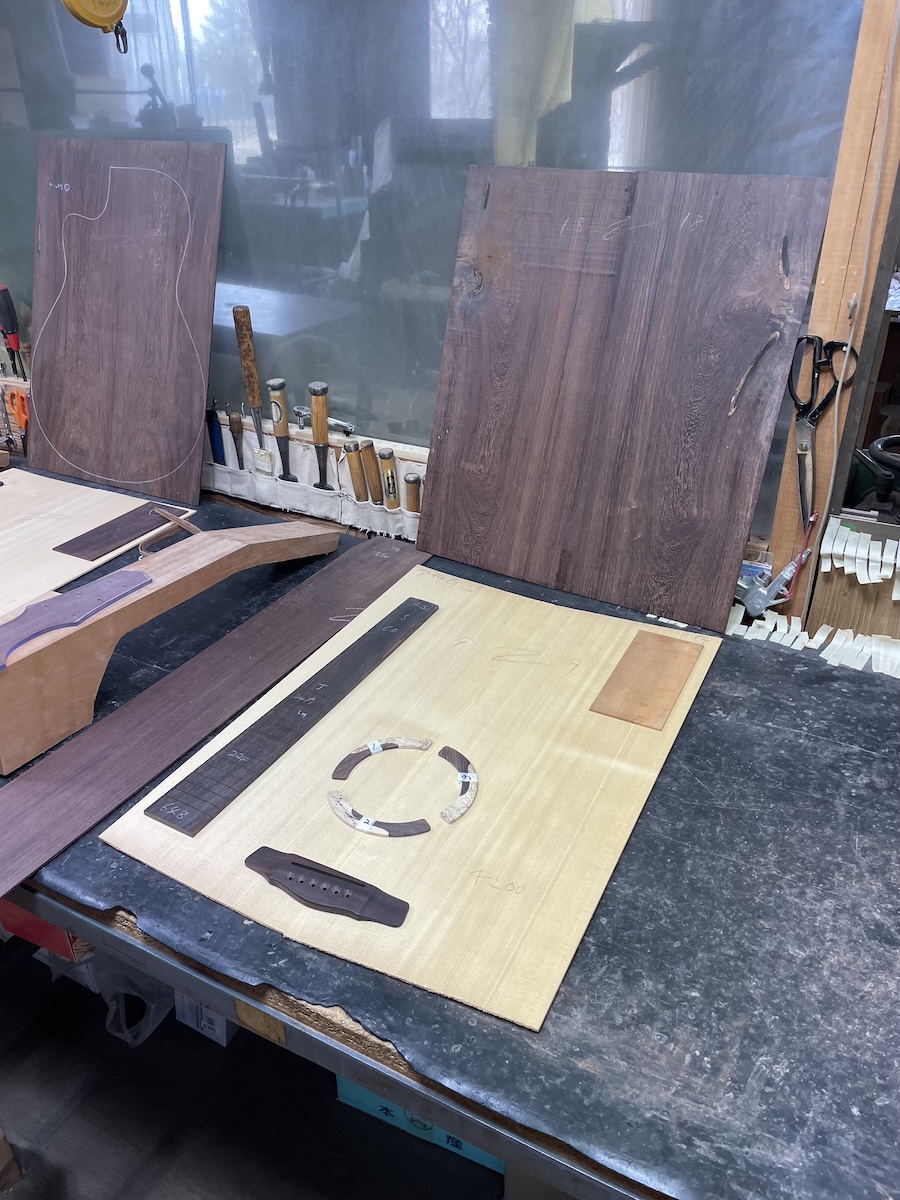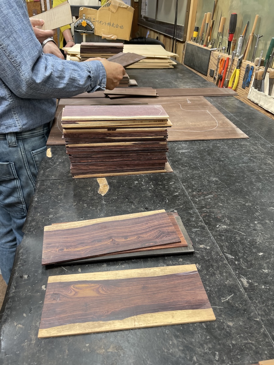 ある程度材料が決まってきたところで、トップ材、ヘッド天神材、指板&駒材など、候補に上がっていた中から再選定です。
