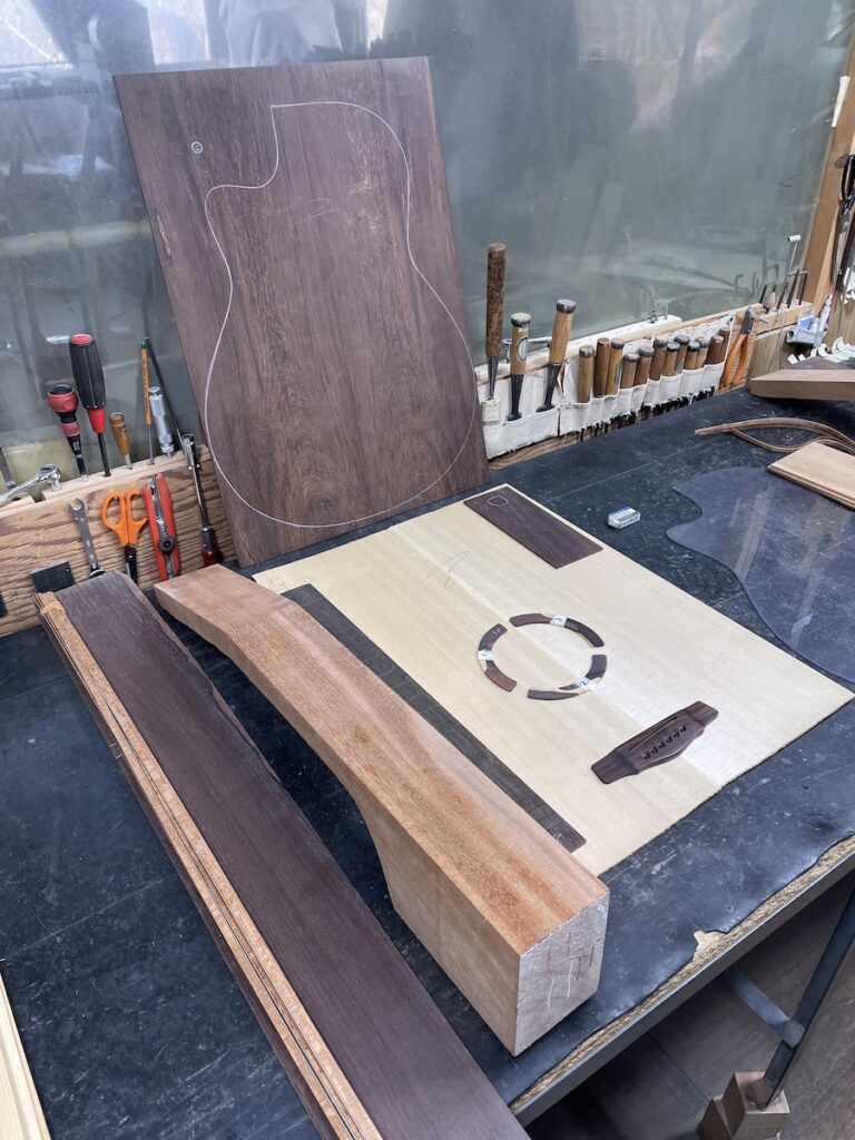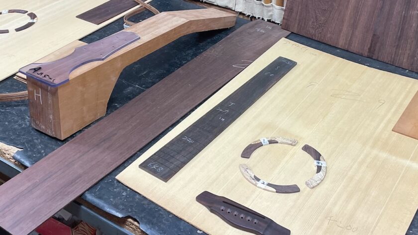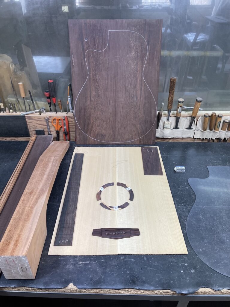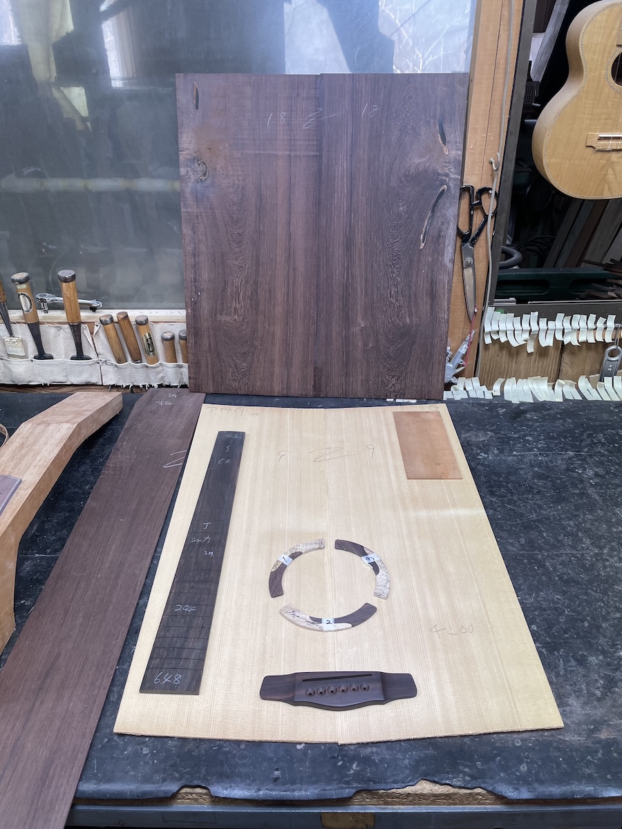 ある程度材料が決まってきたところで、トップ材、ヘッド天神材、指板&駒材など、候補に上がっていた中から再選定です。