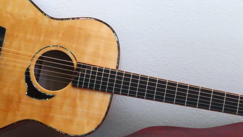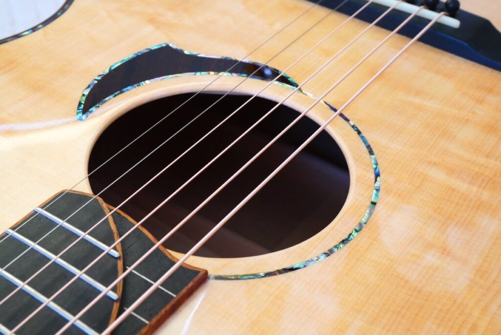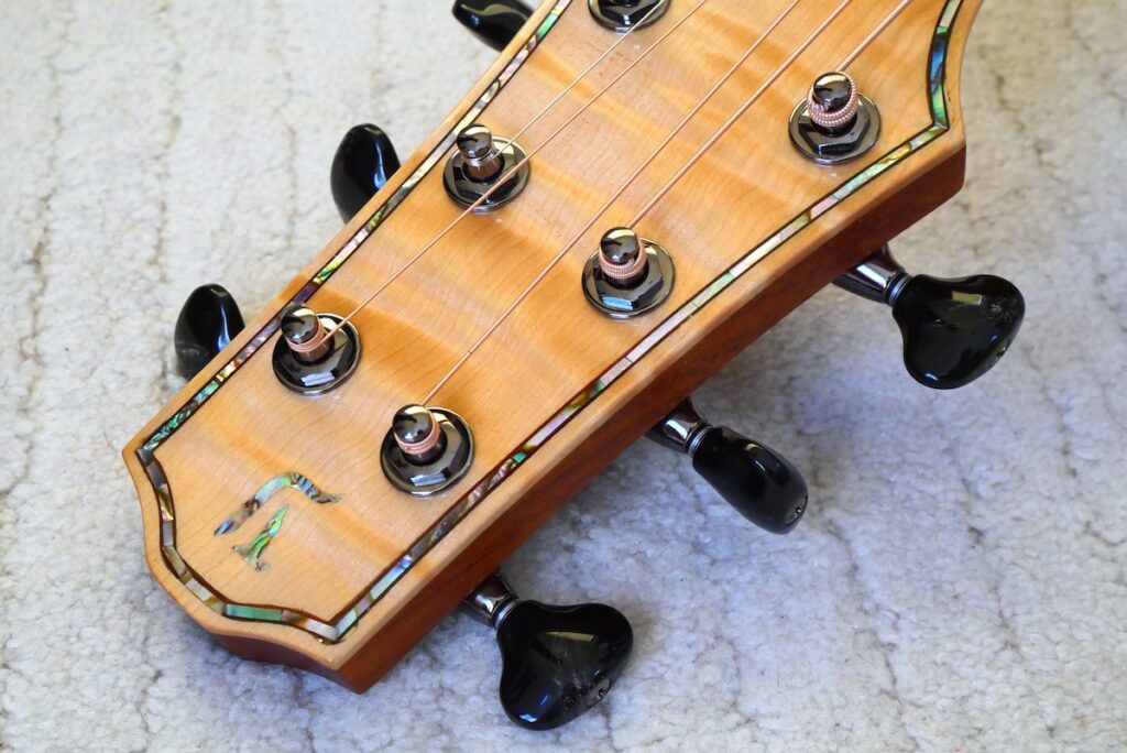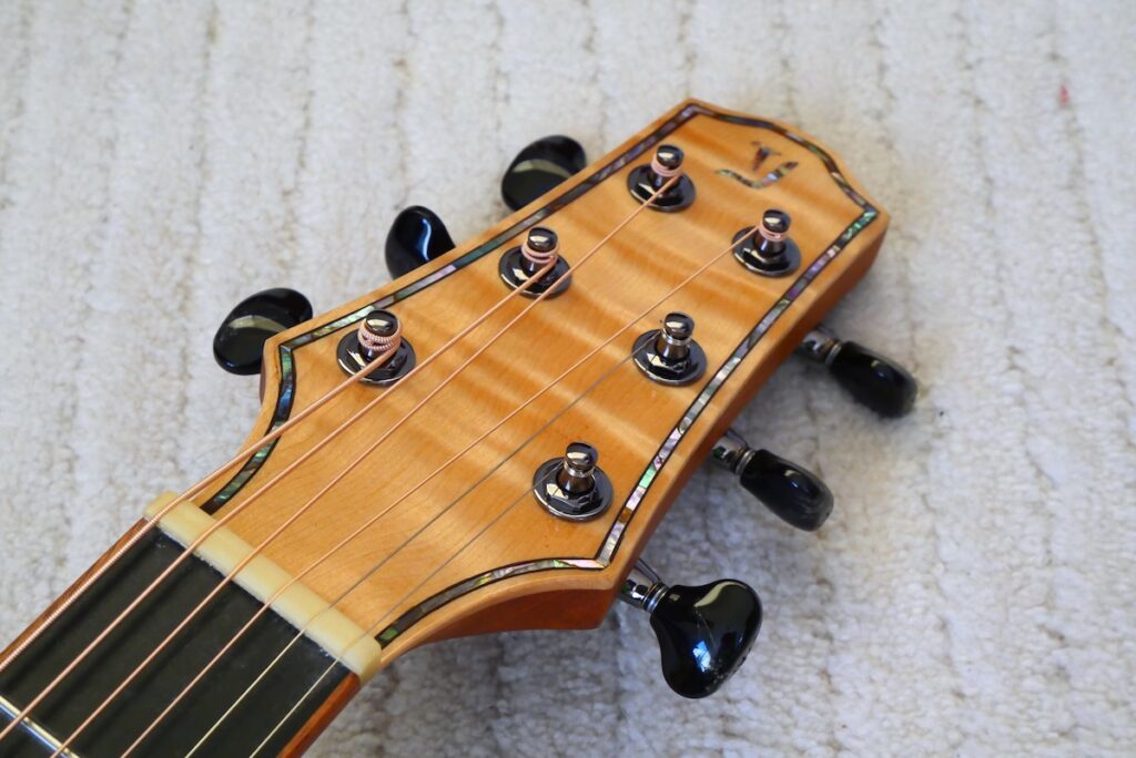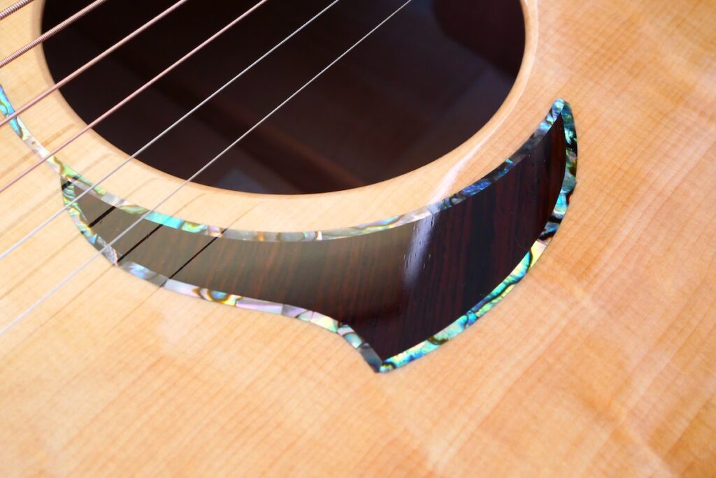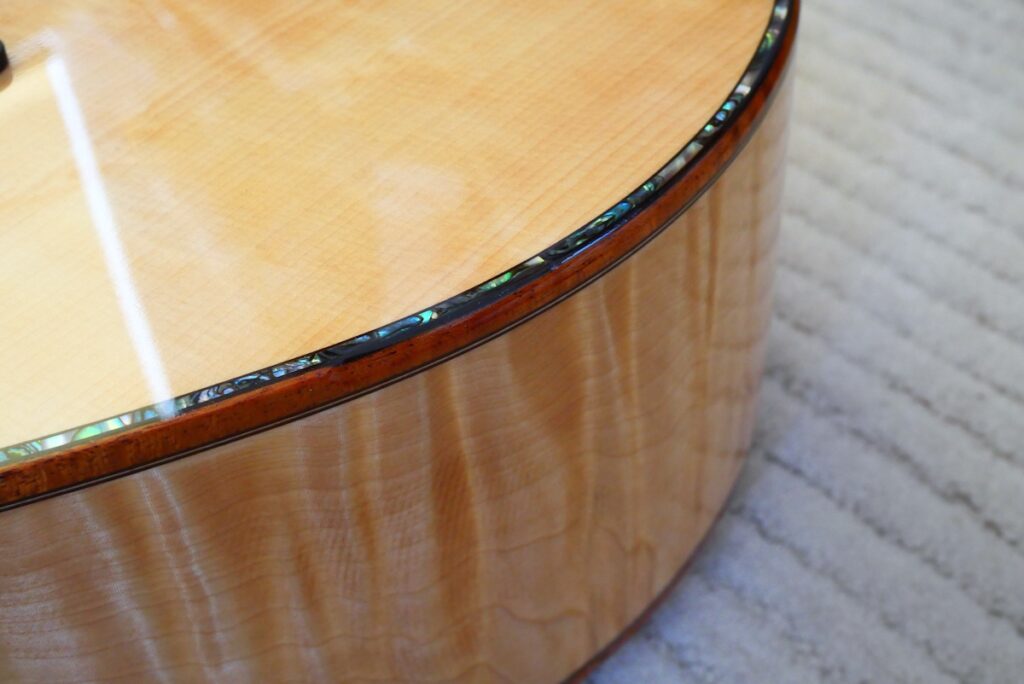ロゼッタにはブラジリアンローズウッド、ヘッドトップにはとち材を合わせました。ヘッドトップ、ボディトップに、美しいアバロンパーフリングをあしらった、アニバーサリーモデルに相応しい仕様となっています。
