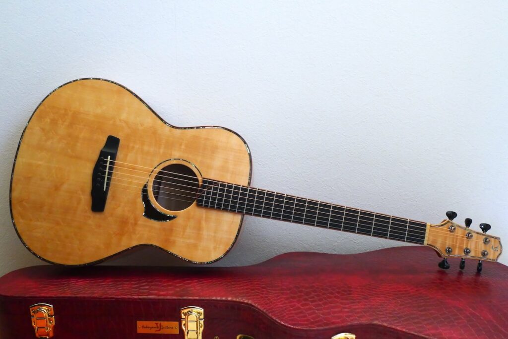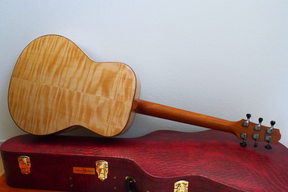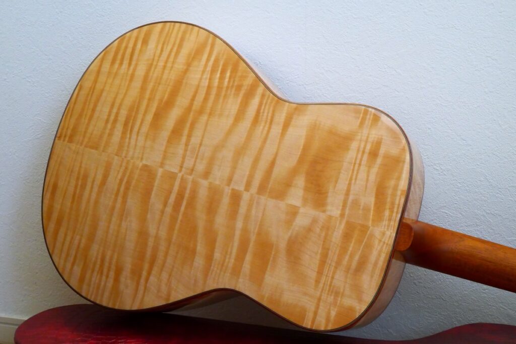 工房に長年寝かせてあった、極上のジャーマンスプルース(ベアクロウ)トップに、稀少なワイドフレイムの杢が入ったとち材をバック&サイドに採用しました。