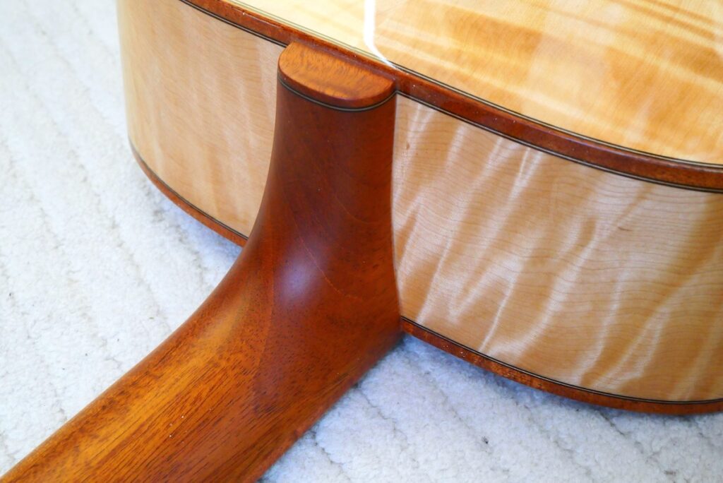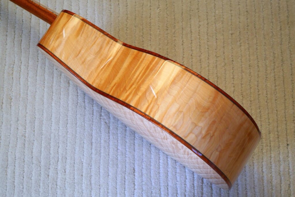 ネック材には、稀少なホンジュラスマホガニーのワンピース材、バインディングには、杢の美しいフレイムマホガニーを採用しています。