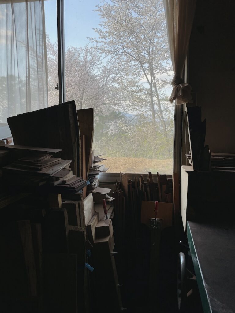 工房の窓から見える山桜はとても良い感じ。今年は桜の時期が早く、この時期でソメイヨシノがすでに散りかけています。