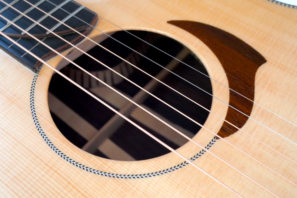 サウンドホールロゼッタは、Yokoyama Guitarsらしい、象徴的なPGスタイルです。マダガスカルローズウッド材を埋め込み、珍しくヘリンボーンラインとなっています。