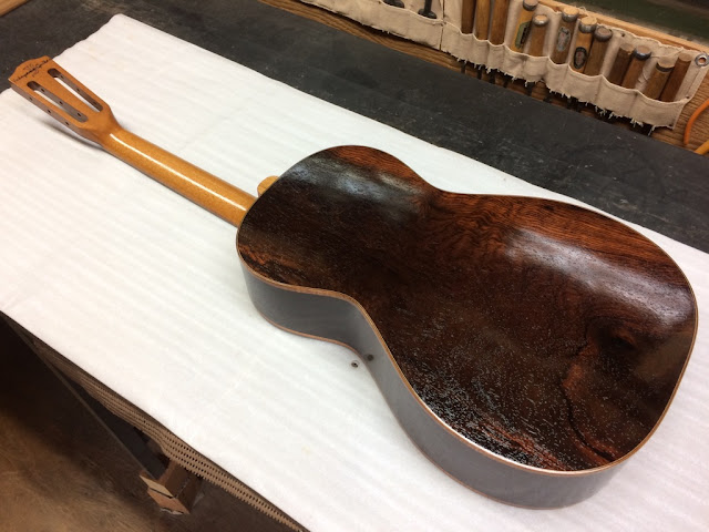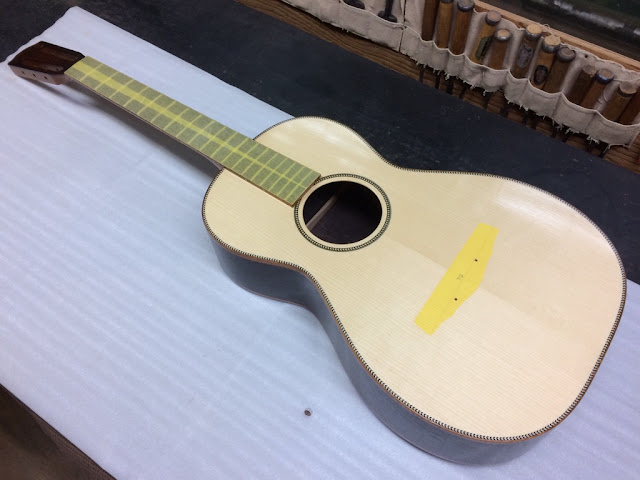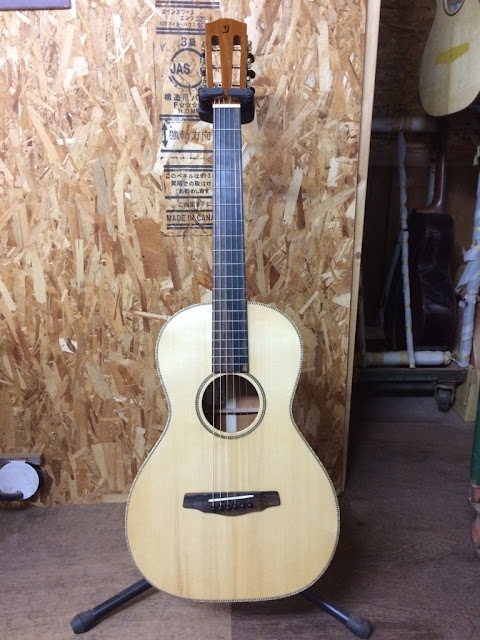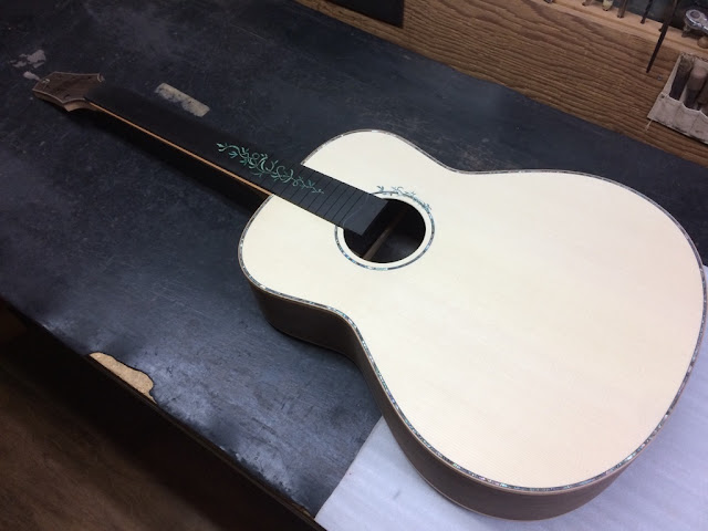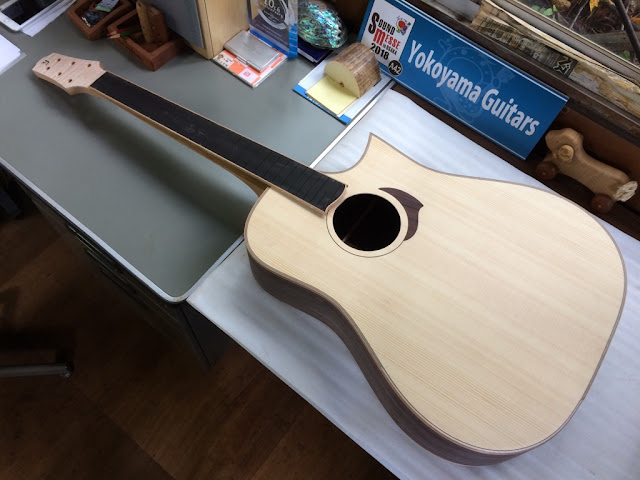 ボディはすでに出来上がってました。ネックもヘッド天神が貼られているので、次はトラスロッドの加工かな?それにしても早いです。