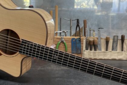 今回はノンカッタウェイモデルという事で、1弦側ネックジョイント部のボディトップにもコンターを入れてあります。ハイポジションを弾く際にボディトップのエッジが当たらず、弾きやすく仕上げられています。