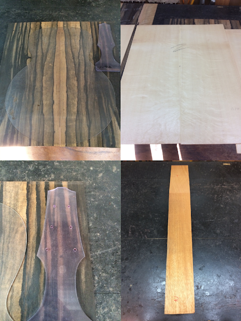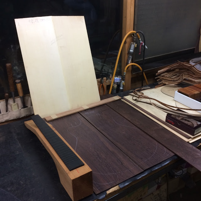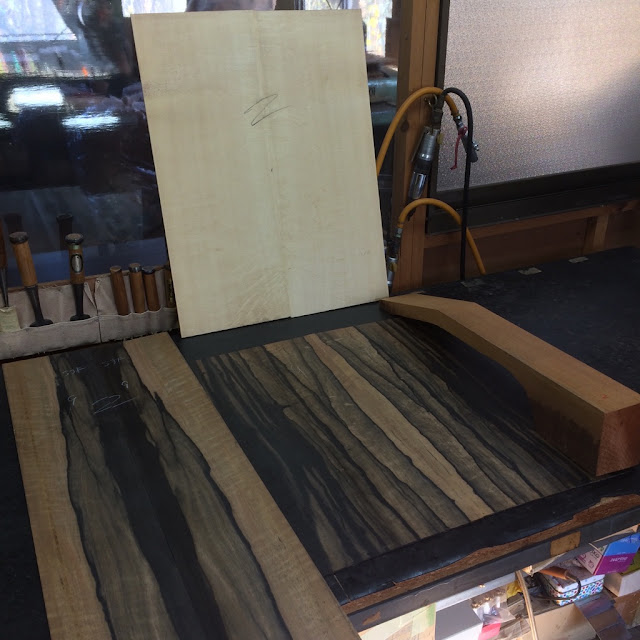 そのあと、先生の淹れてくれたコーヒーを飲みながら雑談して、兵庫県のS様のオーダー材の選定といきます。オーダーモデルはSJF-GEE、ジャーマンスプルーストップ、エキゾチックエボニーサイド&バックですね。
