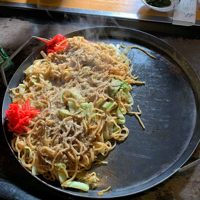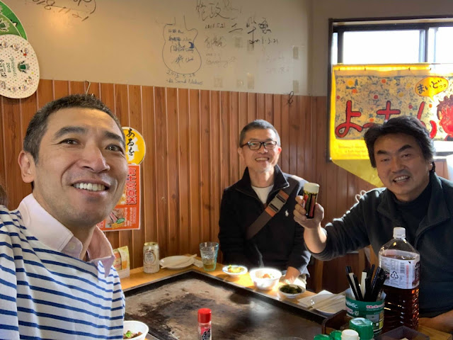 ※Yokoyama Guitarsの社員食堂?!やきそば ” よっちゃん ” 。左から神奈川県 U様、富山県 N様、ワンダートーン坂本さん(奥さんがよっちゃん)。お客さんたちの楽しんだやきそば・・・悔しい。