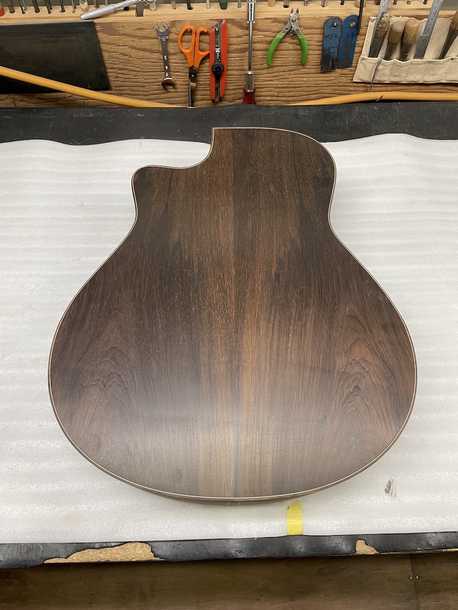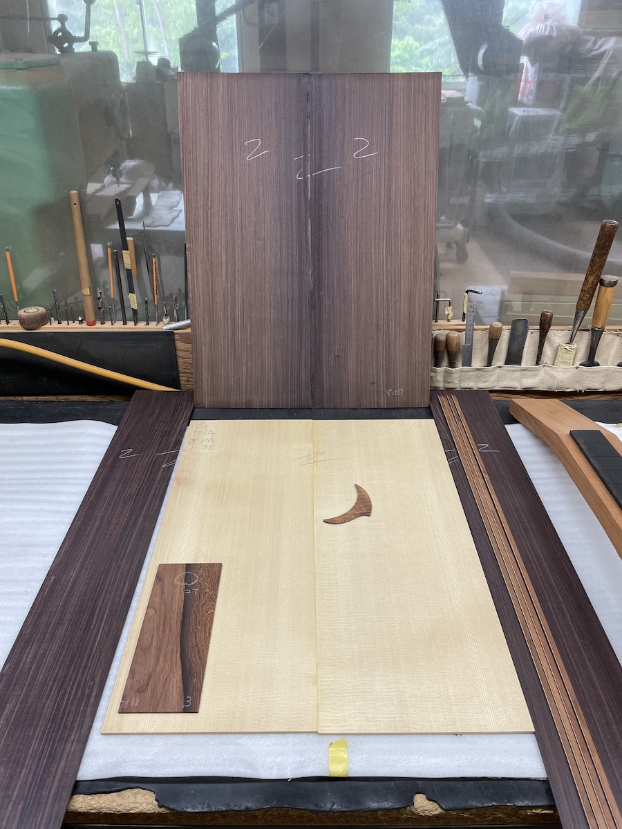 ジャーマンスプルーストップ、インディアンローズウッドバック&サイドのANとの事で、シンプルではありますが、各所の材料配色でオリジナリティの見せ所です。