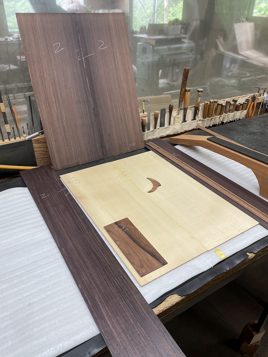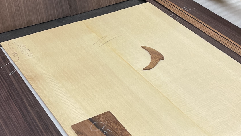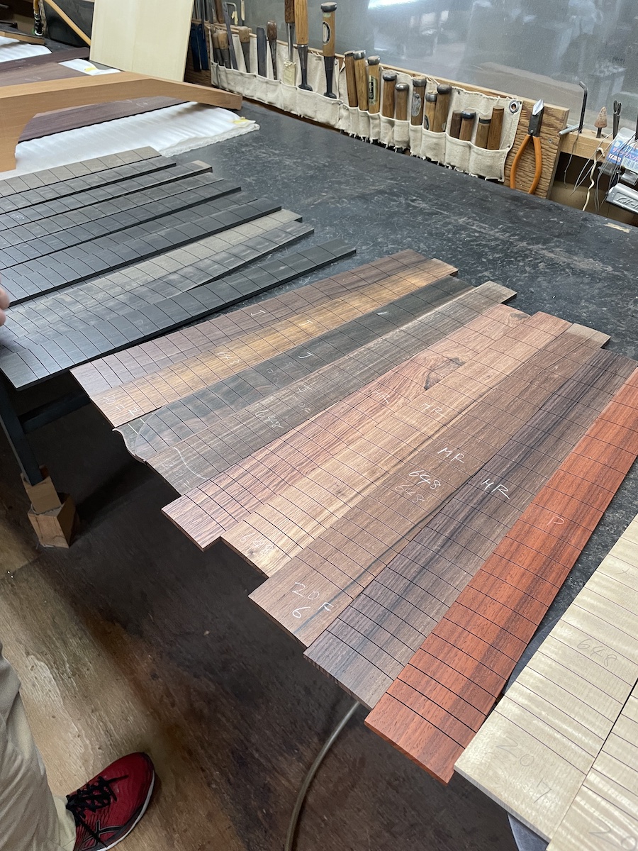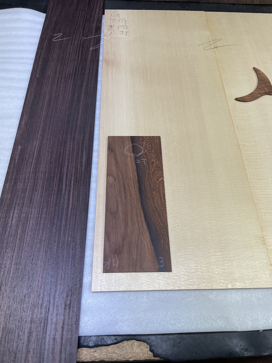 今日は少しおしているので、工房に戻って材料選定の続きです。ヘッド天神板にはマダガスカルローズウッド&コアロゴ。埋め込みPGには杢の美しいコア材をチョイス。このPG、塗装がのったら相当格好良くなるのでは?!