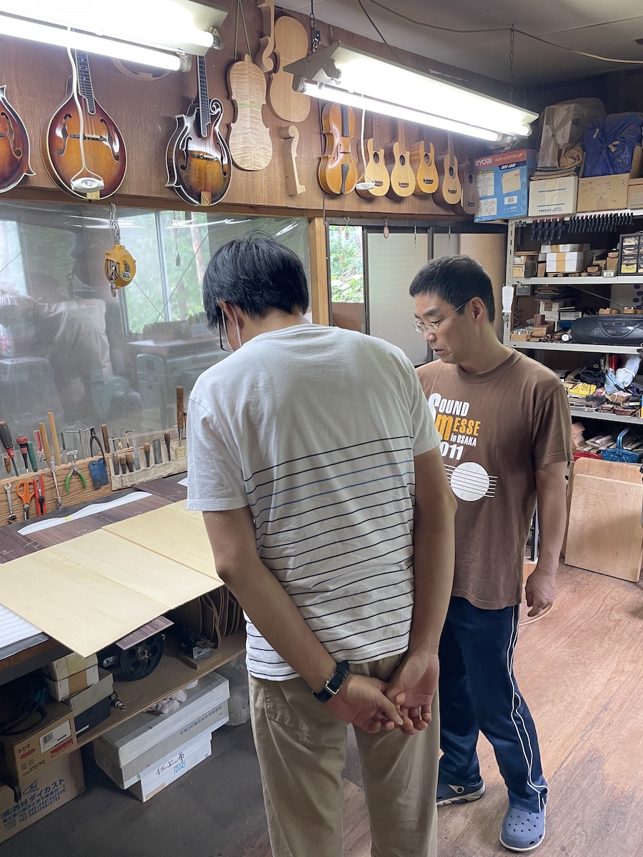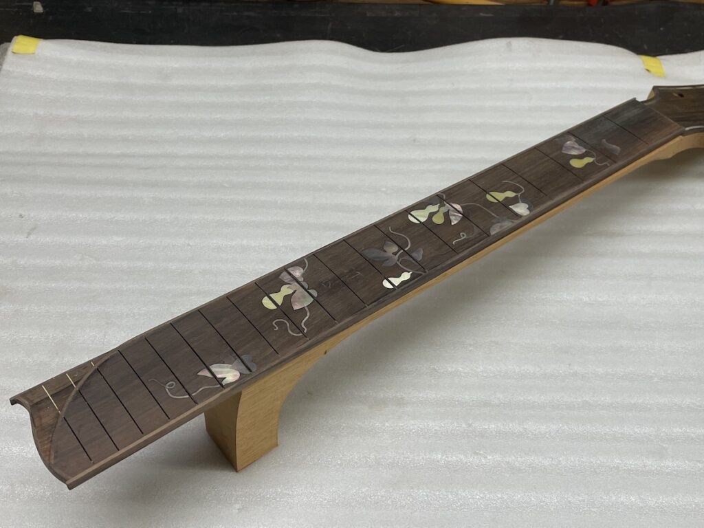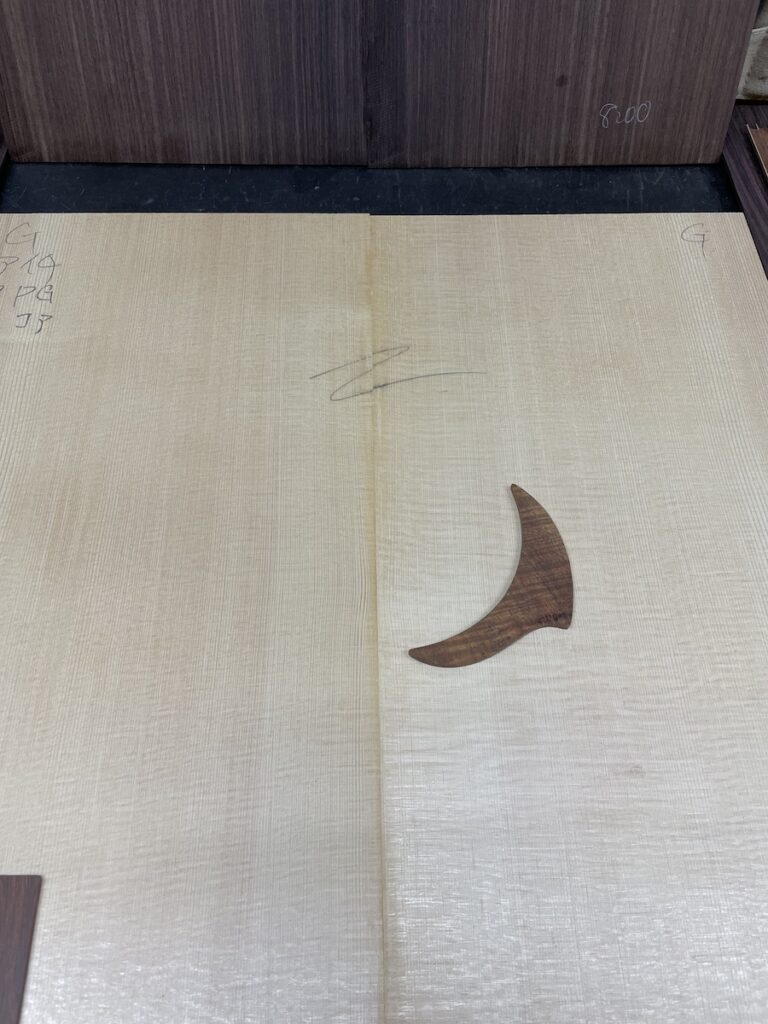 今日は少しおしているので、工房に戻って材料選定の続きです。ヘッド天神板にはマダガスカルローズウッド&コアロゴ。埋め込みPGには杢の美しいコア材をチョイス。このPG、塗装がのったら相当格好良くなるのでは?!
