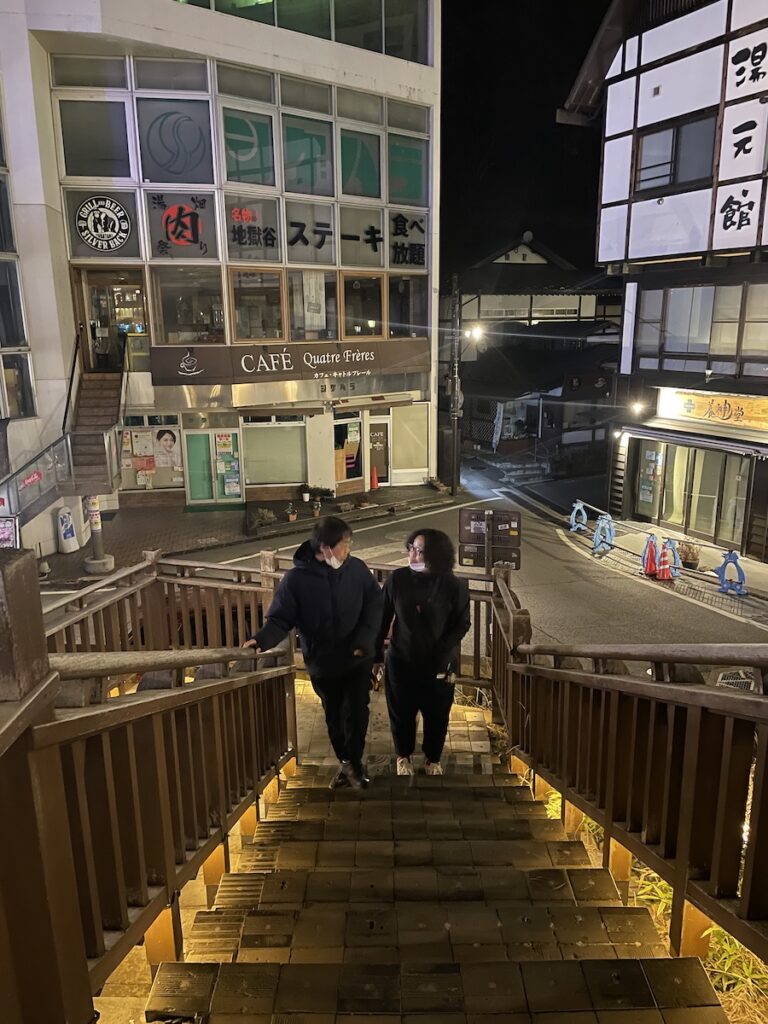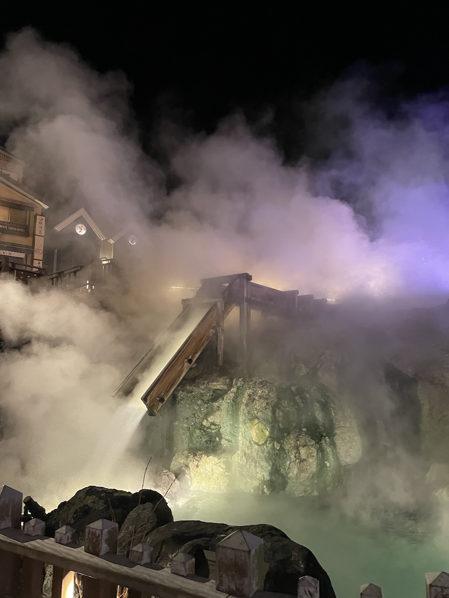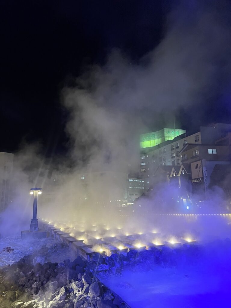風呂も夕食も満喫したあとは、ライトアップされた湯畑へと繰り出してみました。インバウンドの観光客が多いから、こんなにしてるのかしら?それにしても凄い、初めてです。