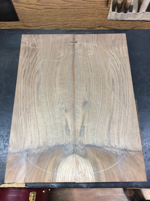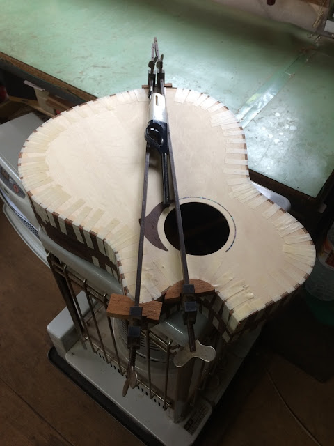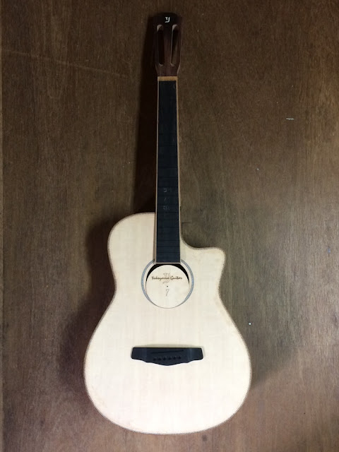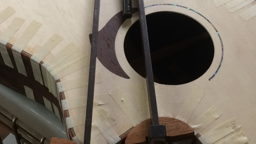 ARを基に両サイドを絞ってもらい、とても良い感じのボディラインになりました。あとは、サウンドホールの位置をコースターの位置ぐらいまで、約10mm下げてもらうことにしました。