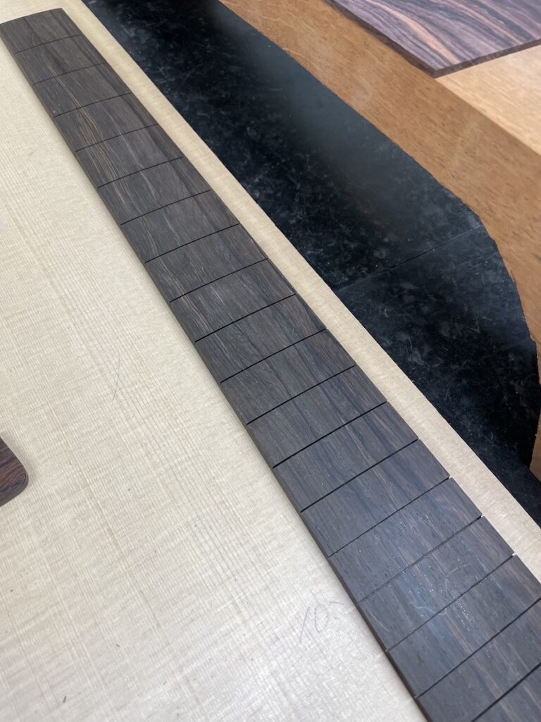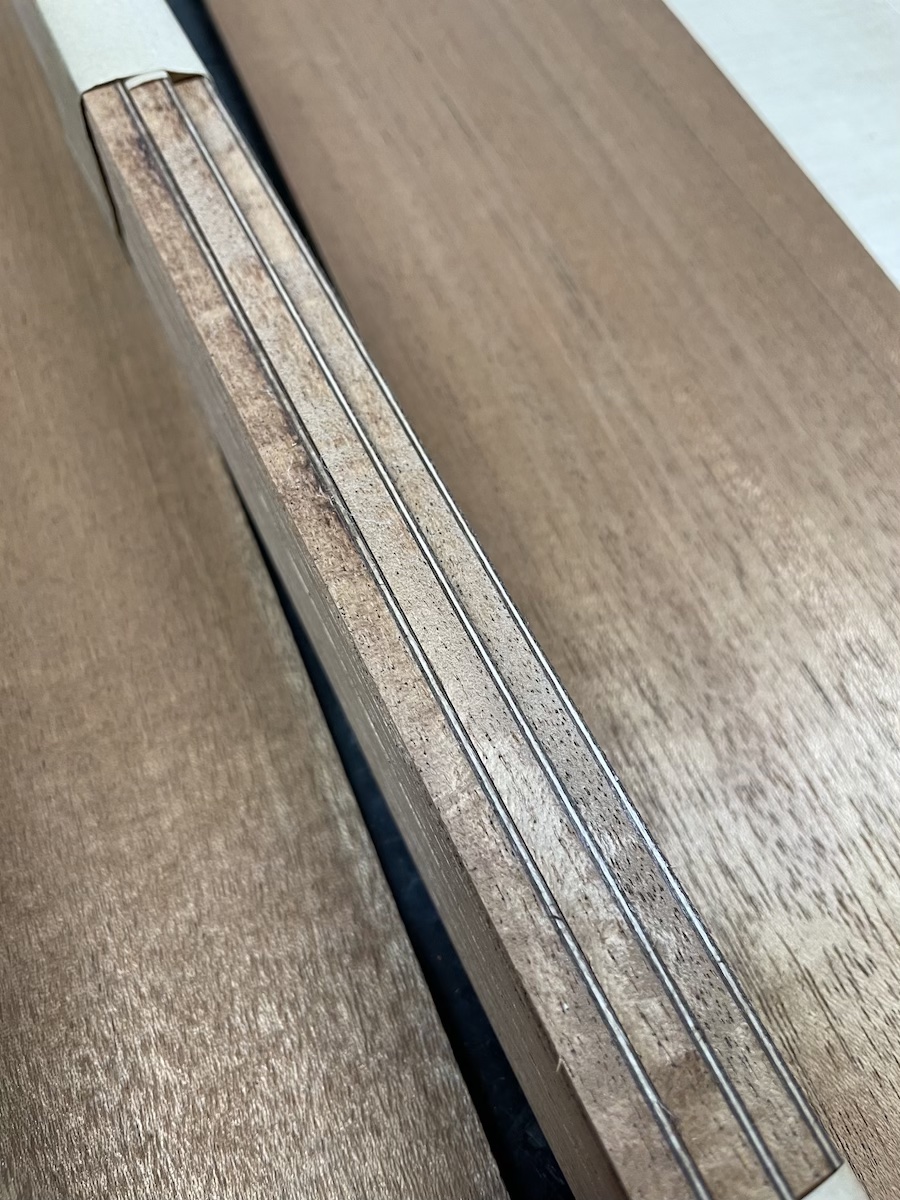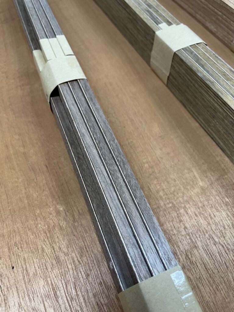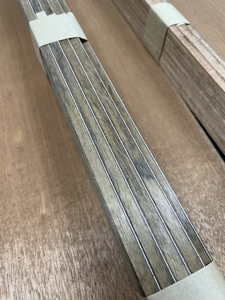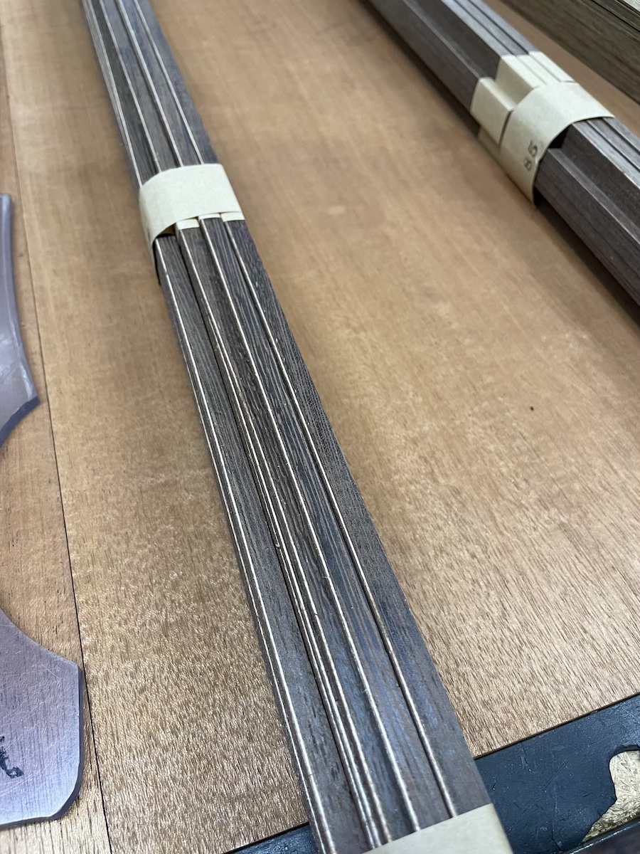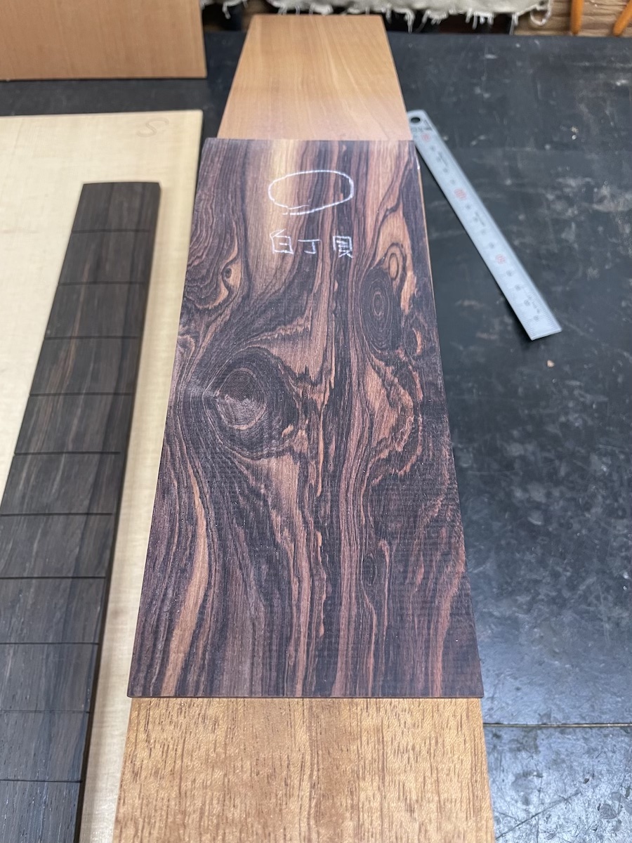 今回は、指板サイドにウェンジ、ボディにフレイムマホガニーをチョイスしました。初めての採用なので、完成がとても楽しみです。