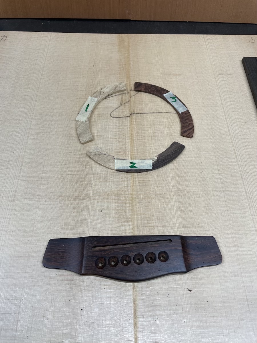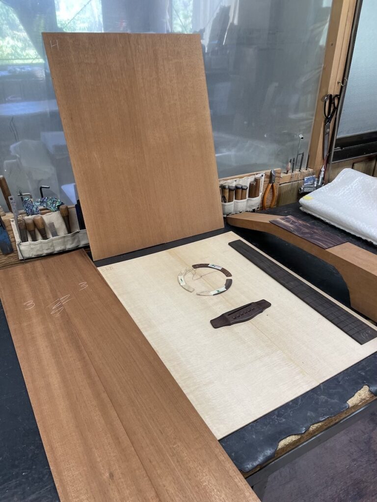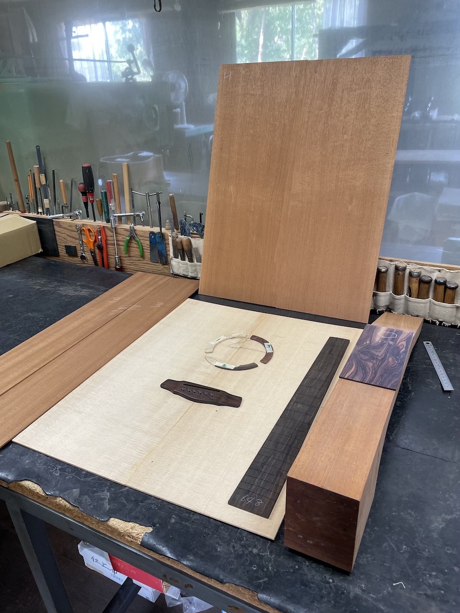 ボディマテリアルは、シトカスプルーストップ、ホンジュラスマホガニーバック&サイド、ホンジュラスマホガニー1Pネック、ブリアジリアンローズウッド指板&ブリッジに決定。