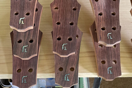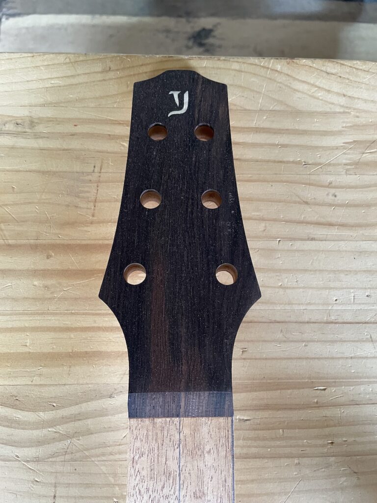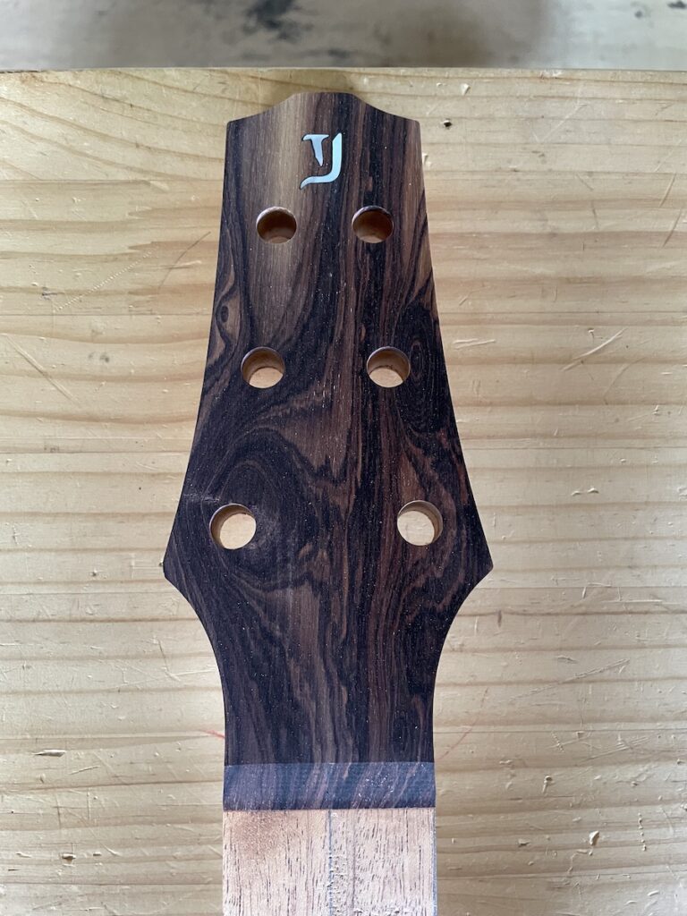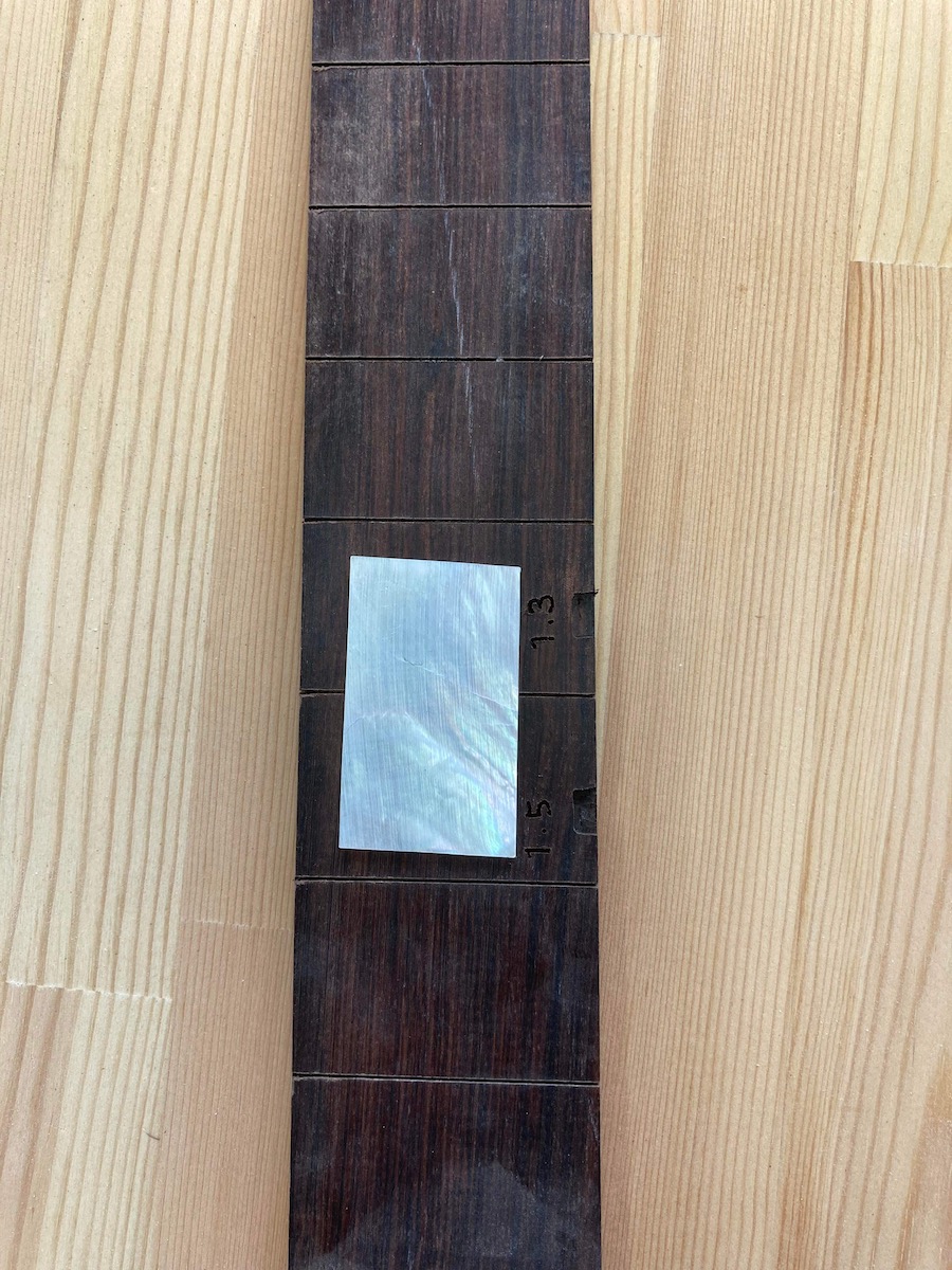 ブラジリアンローズウッドの指板に、白蝶貝でインレイを施しています。シンプルですけど、とても良いアクセントになりますね。ステキです。