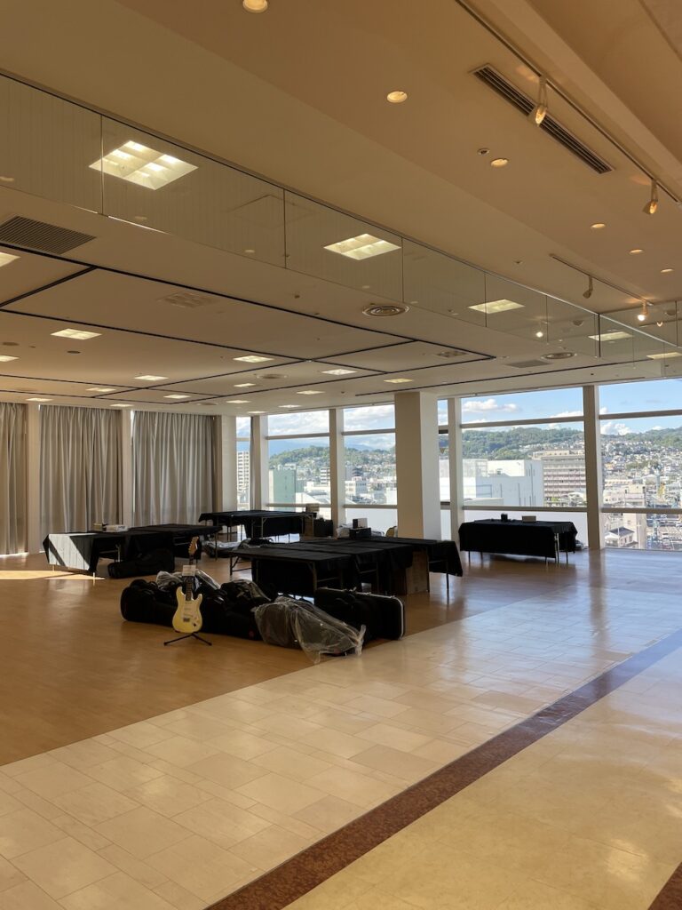 開催前日が搬入日となっており、東京組(橋川夫妻)が楽器類を持ち込み、会場設置です。