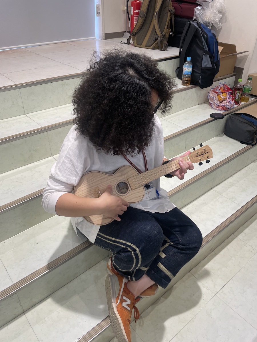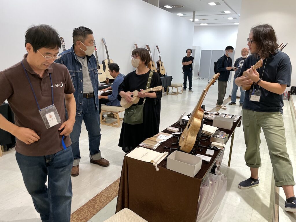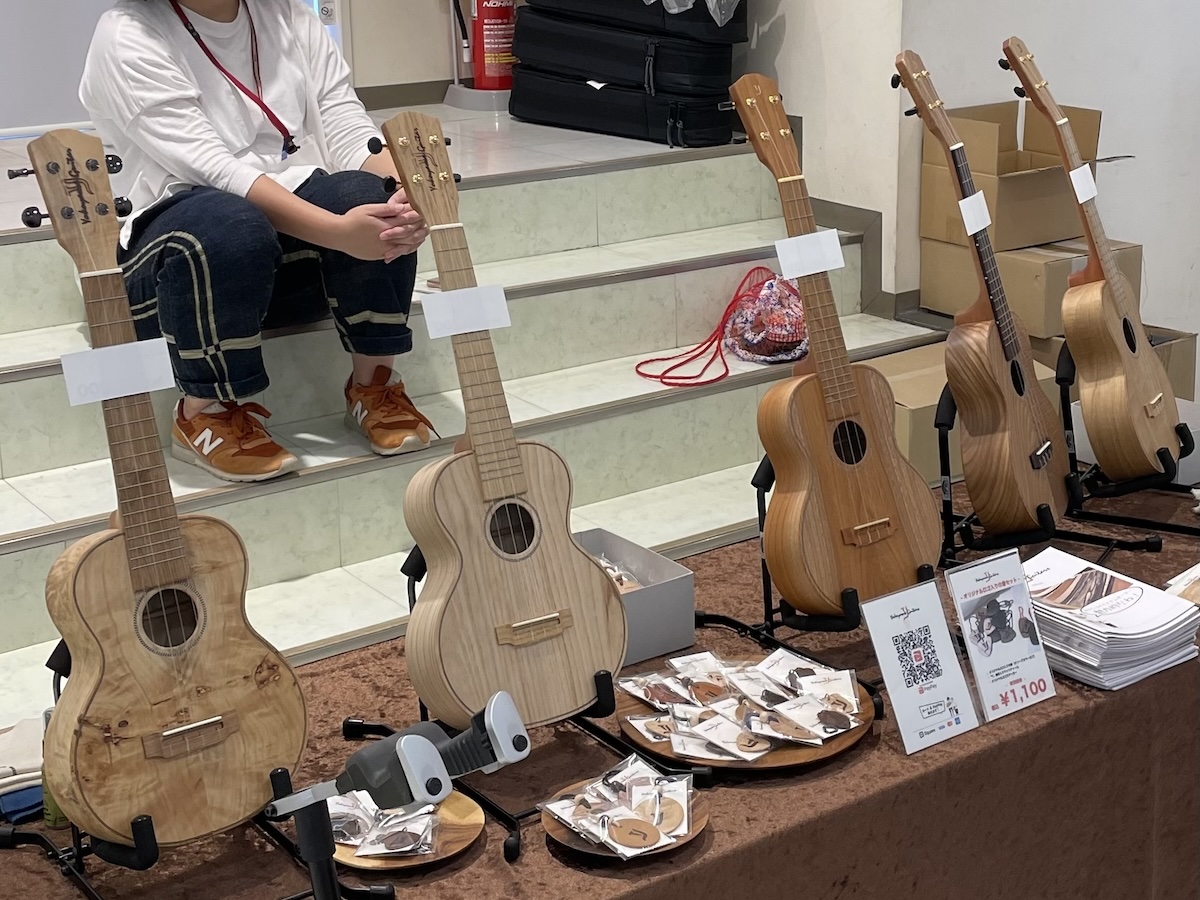 「これ、ウクレレのサウンドホールを抜いた材料なんですよ。」と説明すると、皆さま「おーっ、なるほど!」と、とても良いリアクションをいただけました。嬉しいですね。