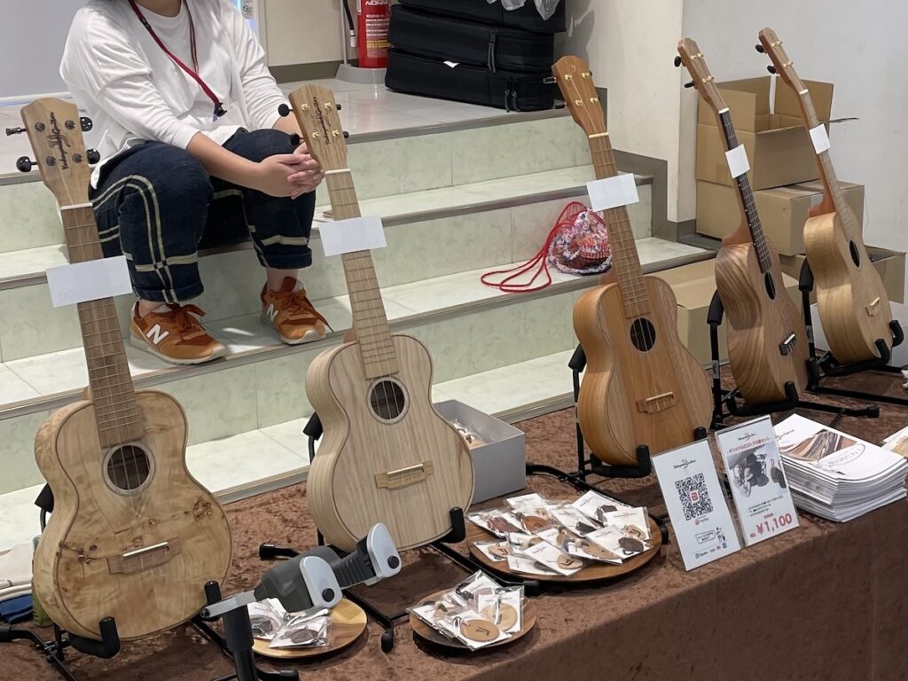展示モデルは、いずれもコンサートウクレレで、欅(けやき)ウクレレ×2、桐(きり)、ポプラの計4本です。プラスして、ソメイヨシノのウクレレも、ラスト1本店頭展示されています。