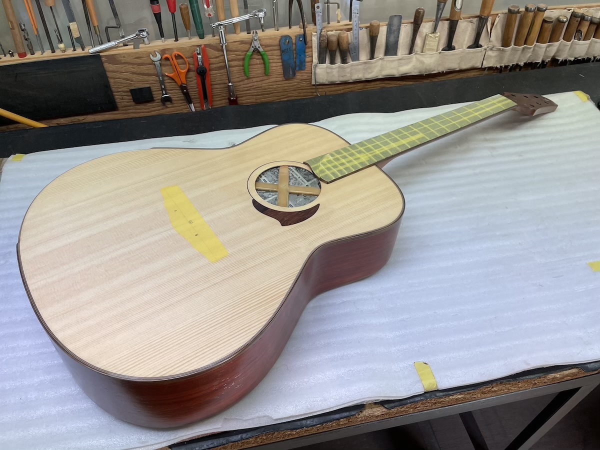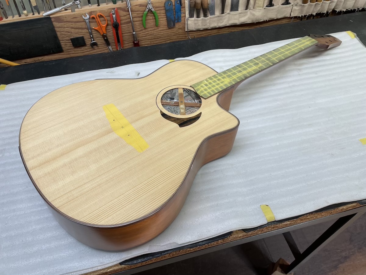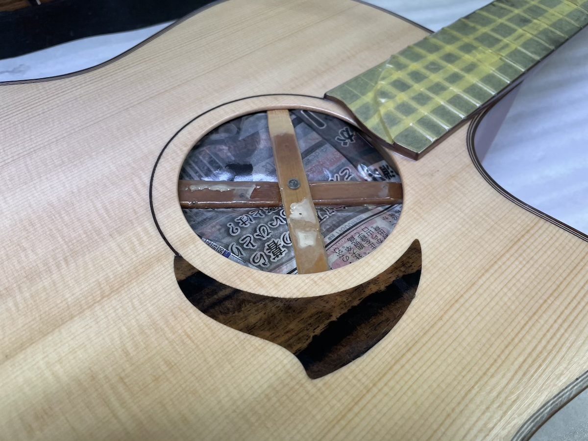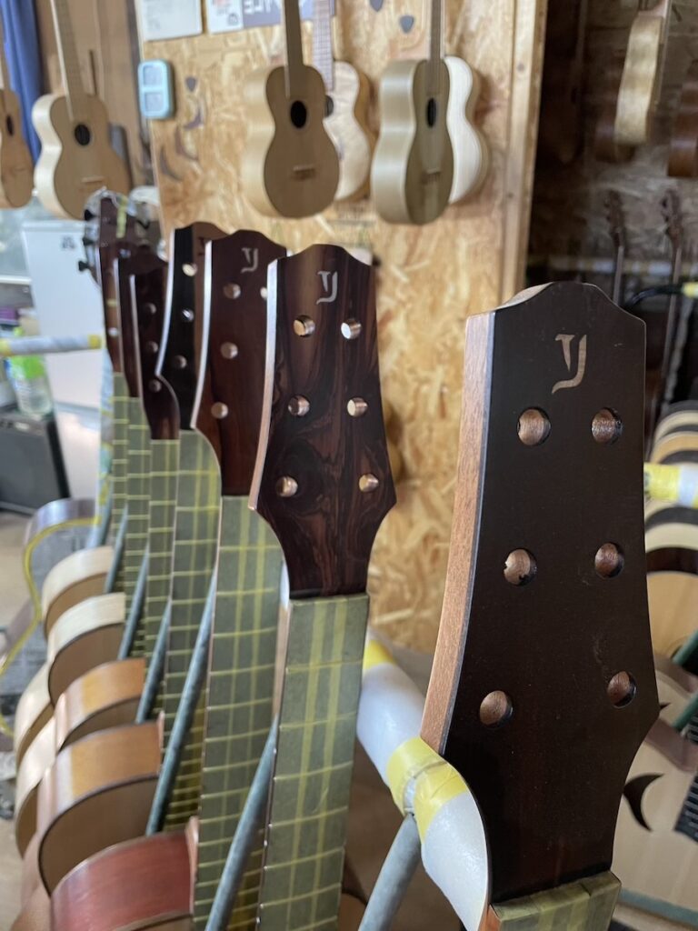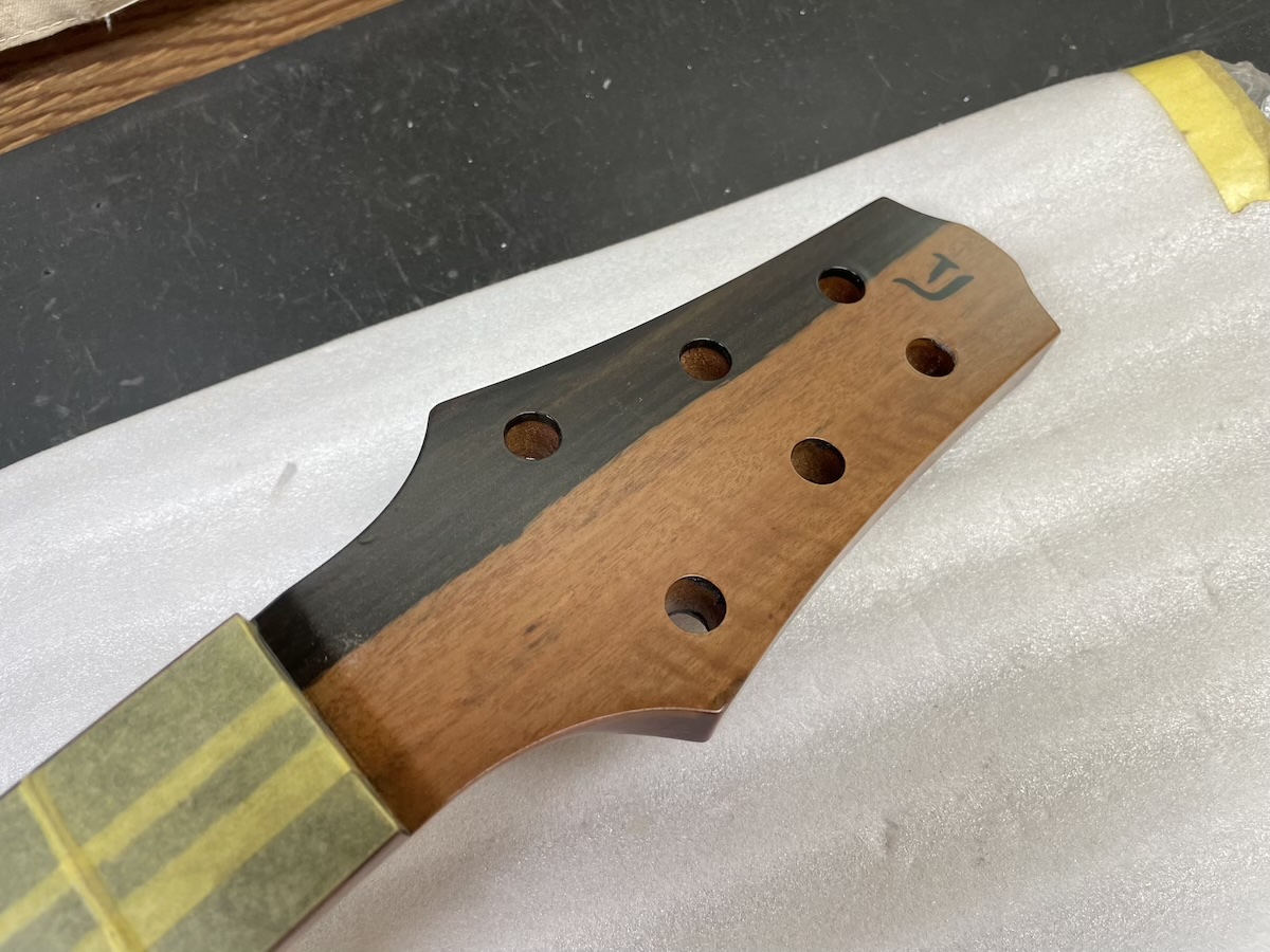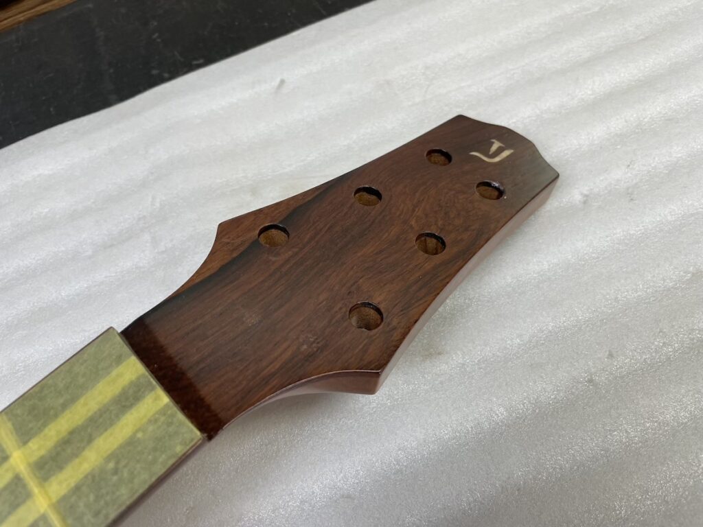 ということで今回、スローテッドヘッドシェイプをしたソリッドヘッド(通常のペグ仕様)を採用してみました。ヘッドトップ、ロゼッタPG材はカマティロです。とても良い雰囲気に仕上がっており、完成が楽しみです。