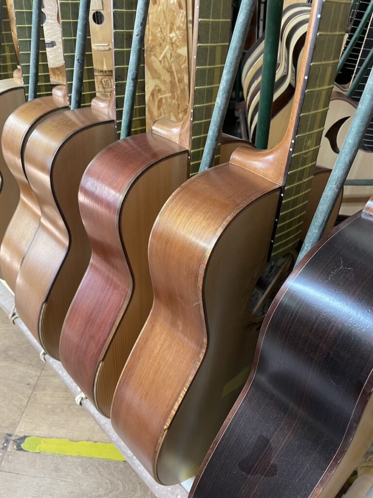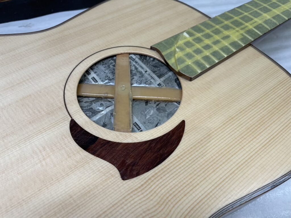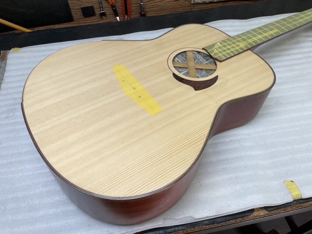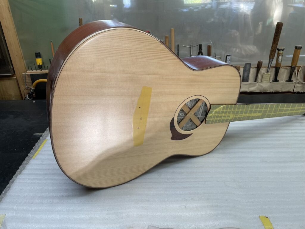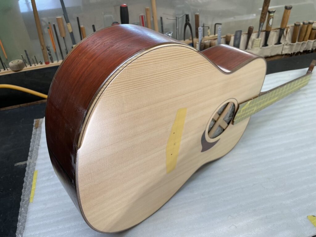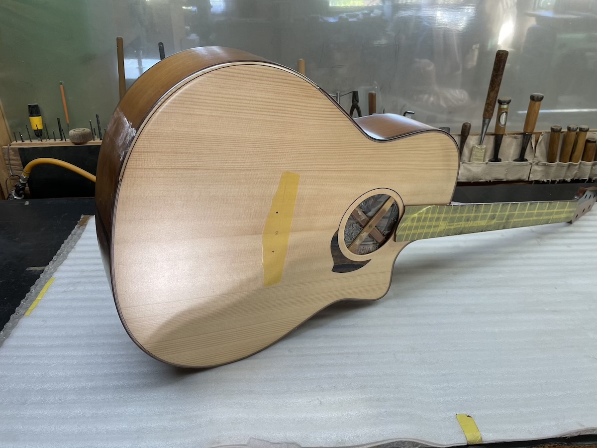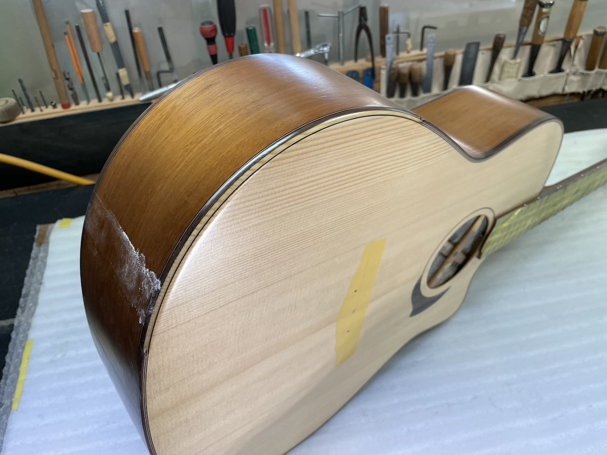 ということで今回、スローテッドヘッドシェイプをしたソリッドヘッド(通常のペグ仕様)を採用してみました。ヘッドトップ、ロゼッタPG材はカマティロです。とても良い雰囲気に仕上がっており、完成が楽しみです。